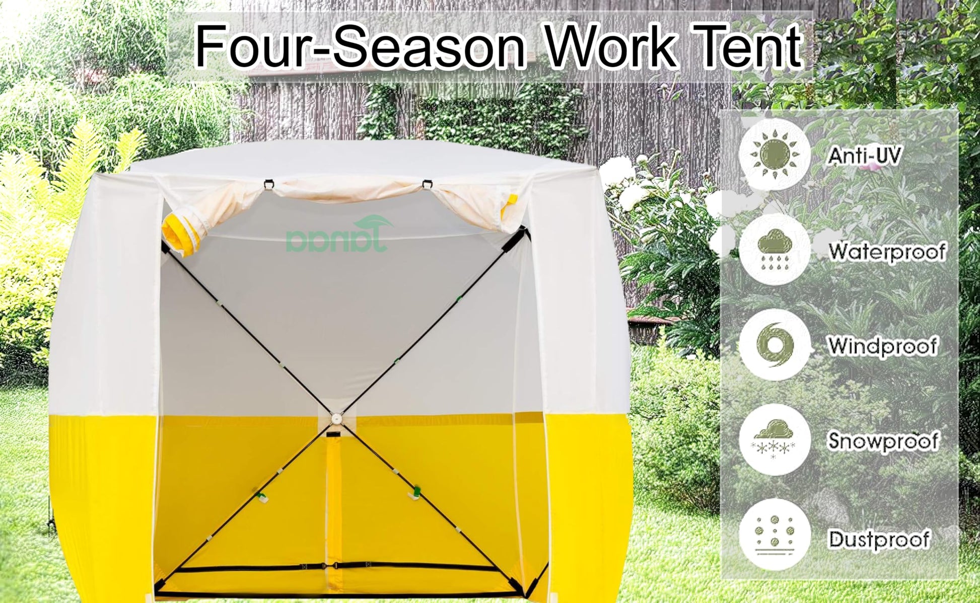 - ⏱️QUICK AND EASY SETUP: The work tent unfolds in less than a minute. No hassle or excessive effort, and no screws to lose. The tent comes with an instruction manual and an assembly video that you'll only need to watch once or twice because it's so simple. Just push the indicated pressure points to make the tent operational. In case of strong winds, anchoring spikes are also included with the tent.
