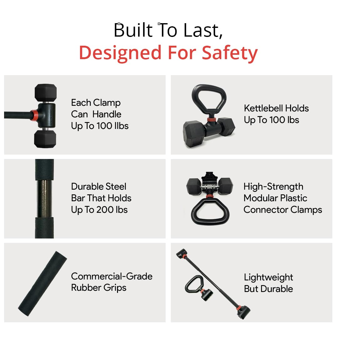 - STRENGTH AND DURABILITY: Enjoy all the benefits of a full barbell set and complete kettlebell set for home gyms with limited space without compromising on strength and durability with the Hyperbell Barbell Bar and high-strength modular plastic dumbbell to barbell connector clamps tested for serious lifting.