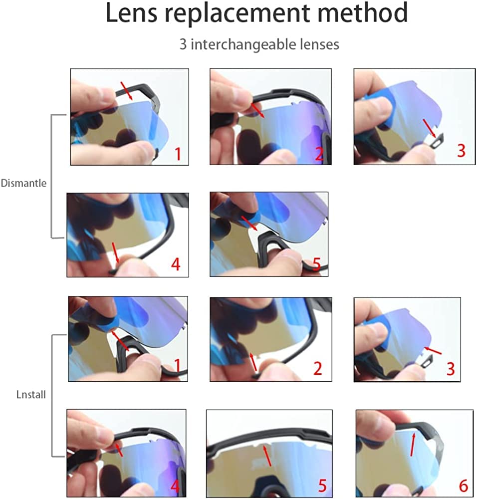 - Three lenses - The main gray lens is a polarized lens that opposes strong sunlight, and the sub-lens is colored sunglasses and a yellow lens for different environmental conditions. All lenses have a UV400 protective coating that blocks UVA, UVB and UVC rays, as well as harmful blue light.