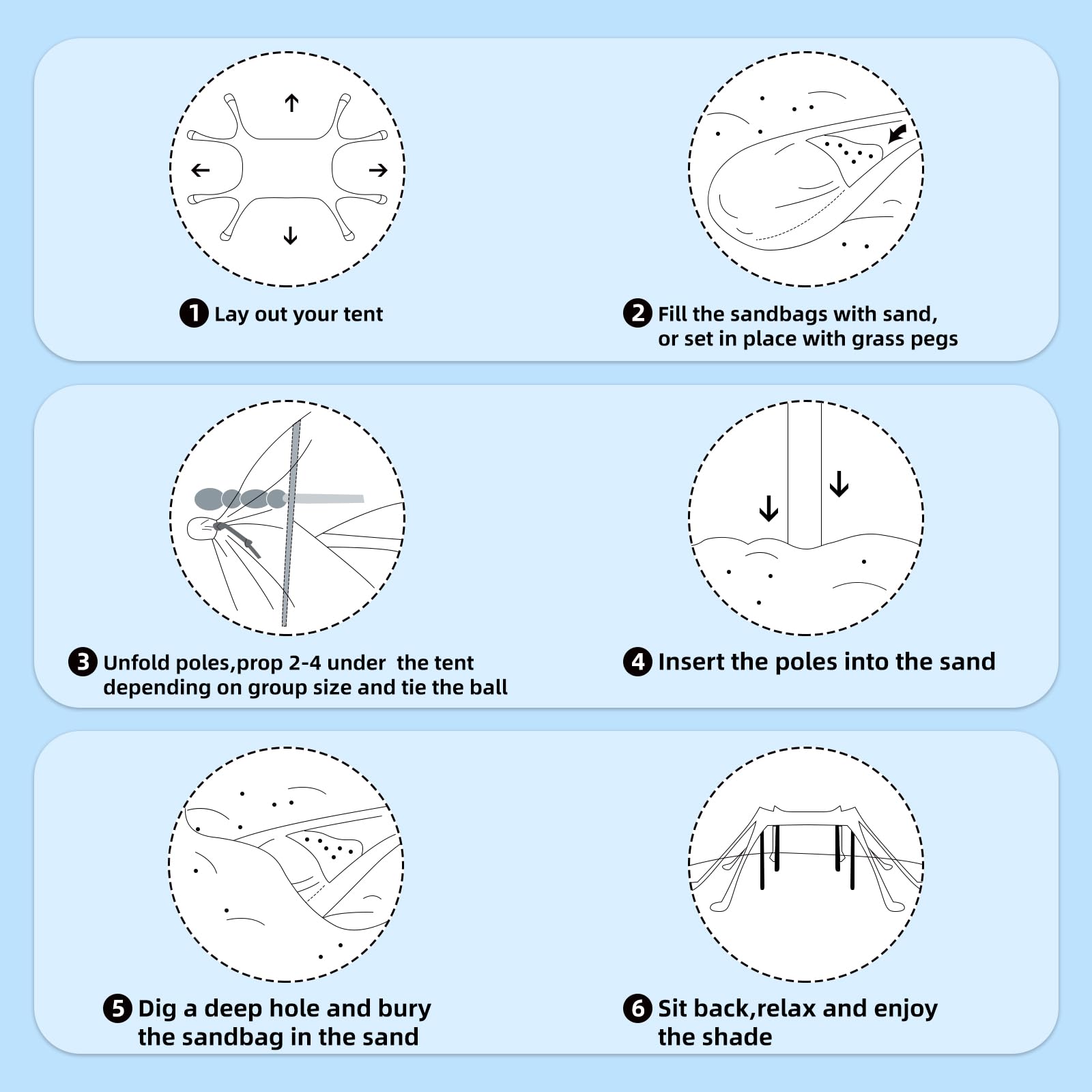 - ● Rich accessories include Beach Tent *1, beach mat*1,Support Poles *4,Carry Bag *1,Bungee Cord Ties *4,Sand Shovels *2 and Grass Pegs *8.