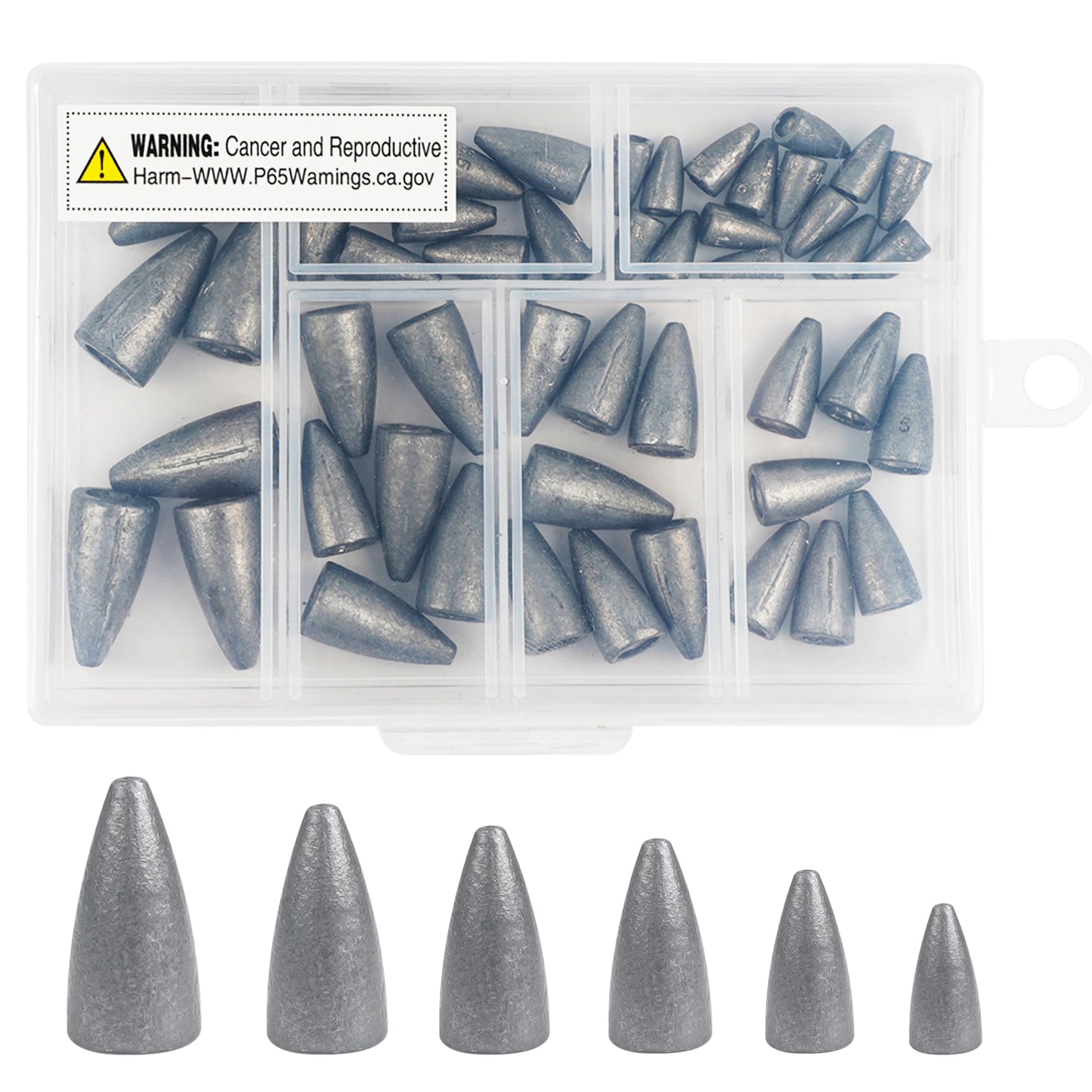 - 【PACKAGE INCLUDE】Bullet worm fishing weights sinker kit contains assorted weights in sizes 1/16oz-15pcs, 1/8oz-8pcs, 3/16oz-8pcs, 1/4oz-7pcs, 3/8oz-6pcs, 1/2oz-6pcs. Total 50pcs in a reuseble plastic box.Multsize will meet your multi fishing options.