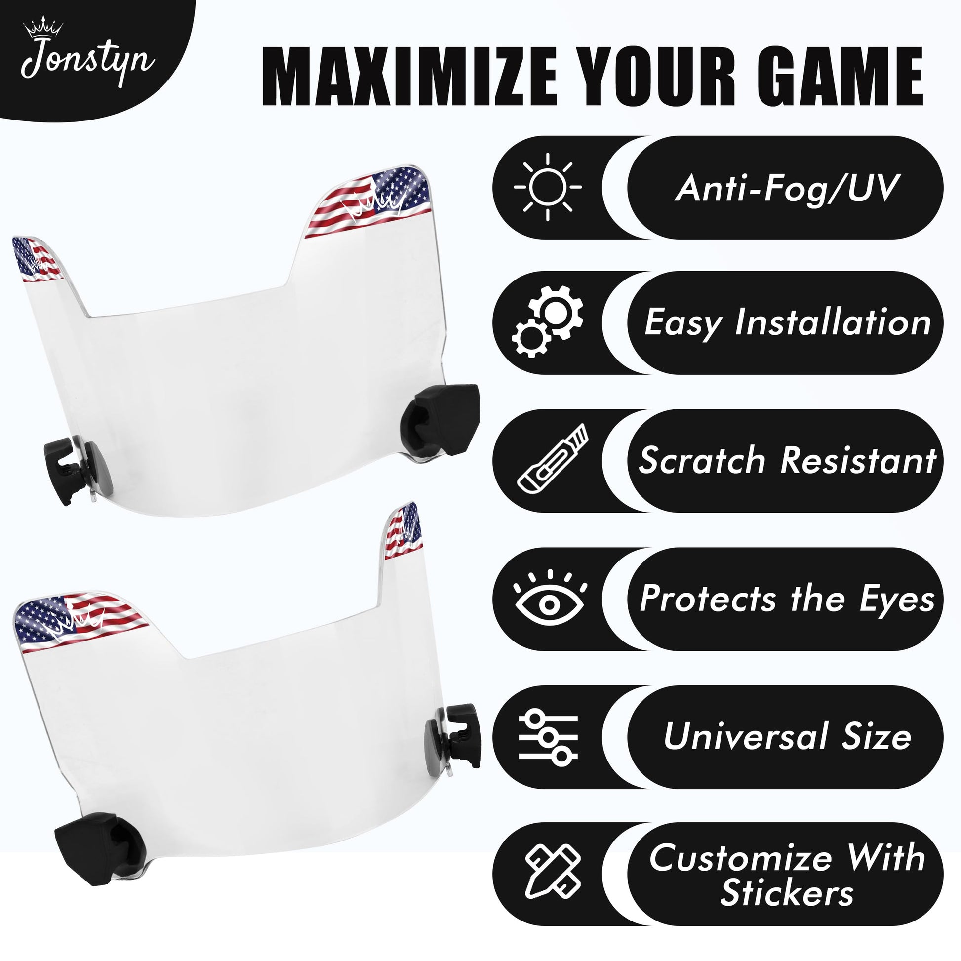 JONSTYN Football Visor with Anti-Fog Clear Shield, 15 Stickers & Storage Bag | Scratch-Resistant, Polycarbonate, Anti-Reflective, Durable & Easy to Install | Universal Fit for Youth & Adult Helmets