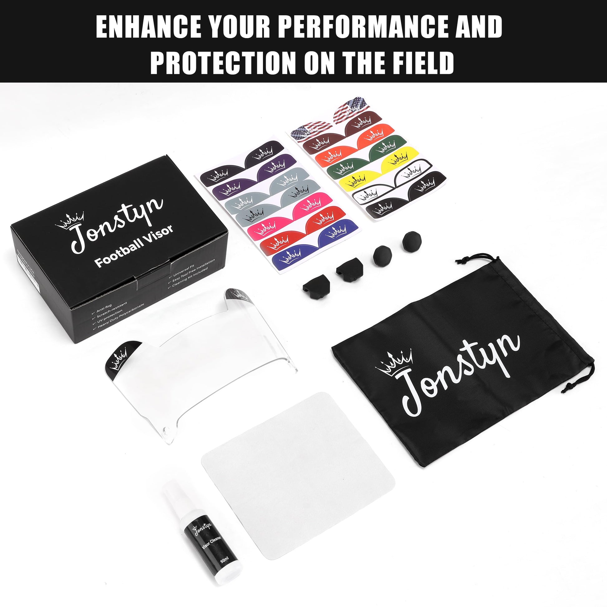 - Each purchase includes a high-quality football helmet visor with 2 attachment clips that make it easy to remove and install the clear football visor in seconds without any tools. There is also a convenient cloth carrying bag for easy transport, a set of 15 vibrant stickers to personalize your gear, and a comprehensive cleaning kit with a cleaning cloth and a specially formulated cleaning solution