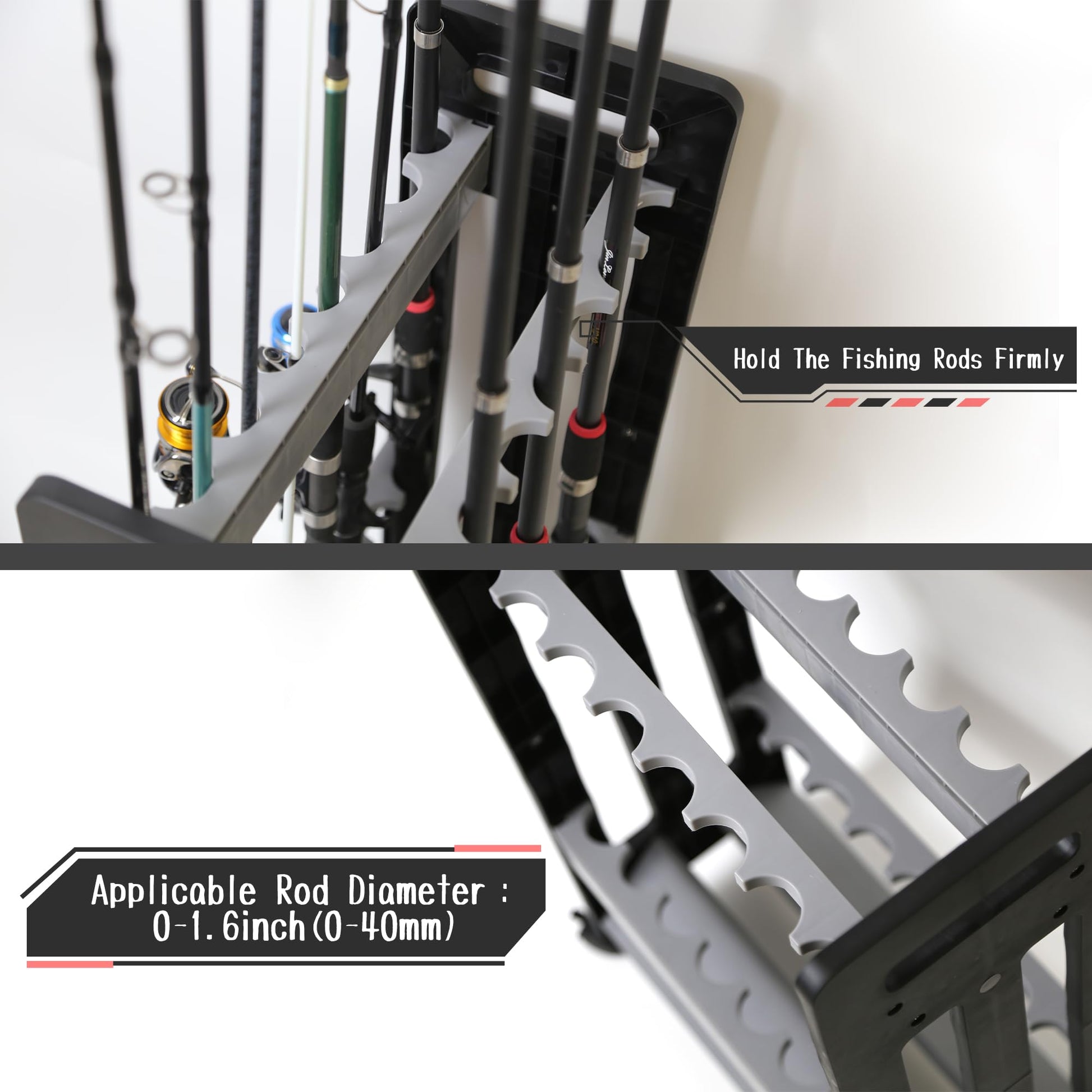 - 🎣【Multipurpose fishing pole holder】:Offers storage on both sides & securely holds up to 16 fishing poles.Also holds ski poles and golf clubs, making it a perfect fishing gear and equipment storage solution for vertical storage.Sturdy base fishing rod rack provides hassle-free garage organizers and storage,keeping all your fishing tools and accessories in one visible spot for quick and convenient access.