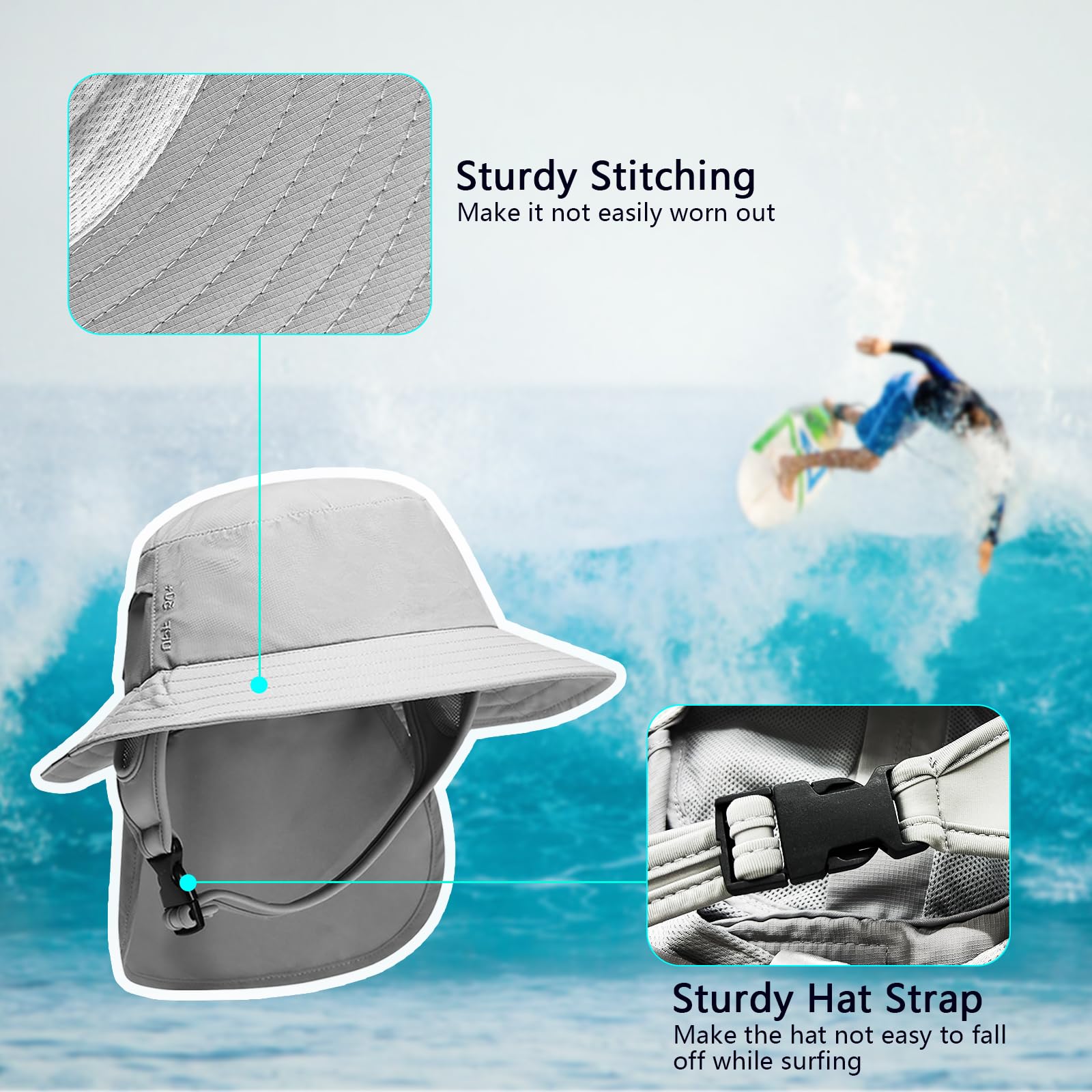 JOYART Surf Hat Bucket Beach Sun Hats with Chin Straps for Surfing,Boating,Riding,Fishing,Hiking,Watersports Men and Women,7cm Wide Stiff Brim-Gray