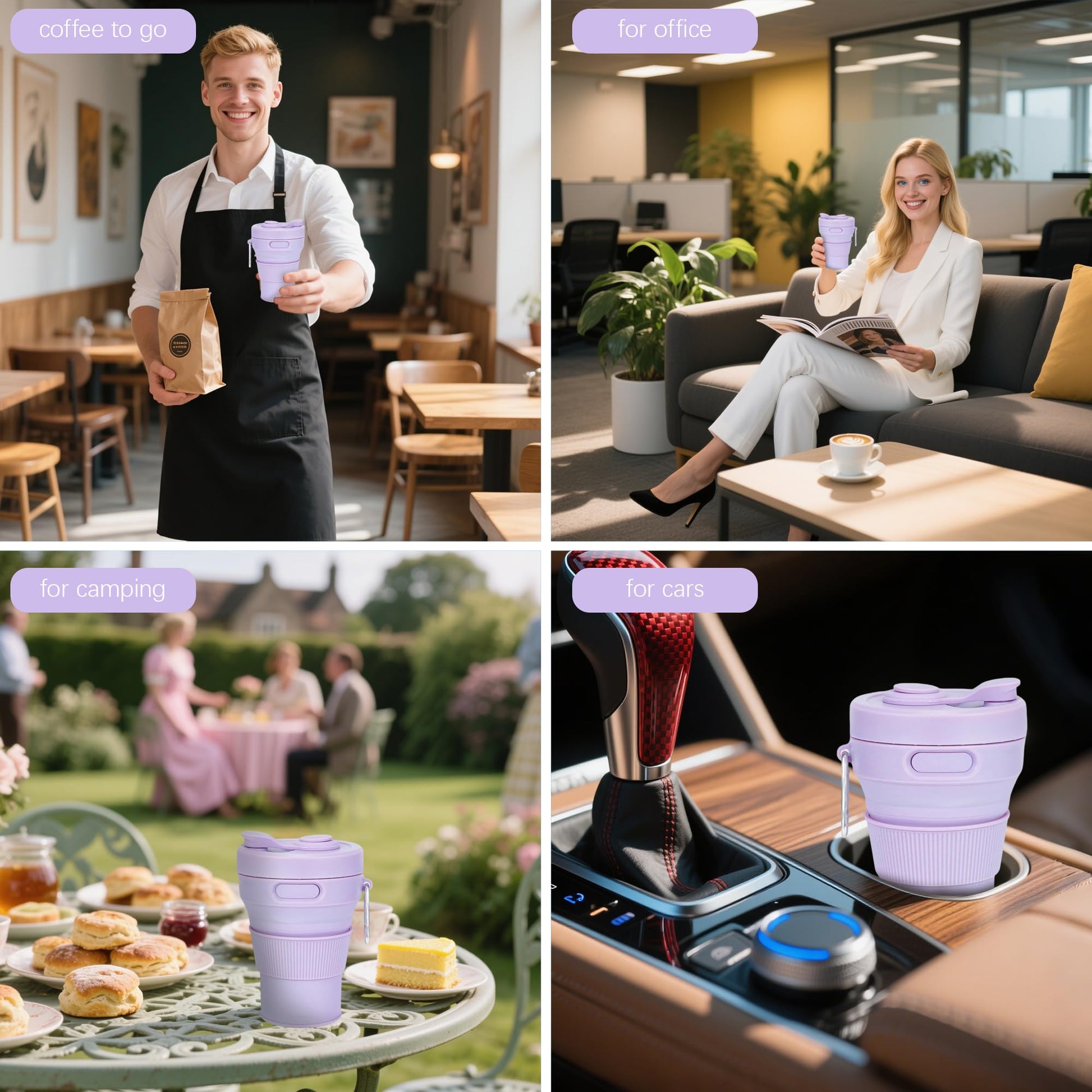 JSHYGOUP Silicone Collapsible Travel Mug Purple 15oz / 450ml - Leak-Proof Reusable Silicone Water Bottle for Hot and Cold Beverages - Travel Office and Home - Dishwasher Safe - Straw Included