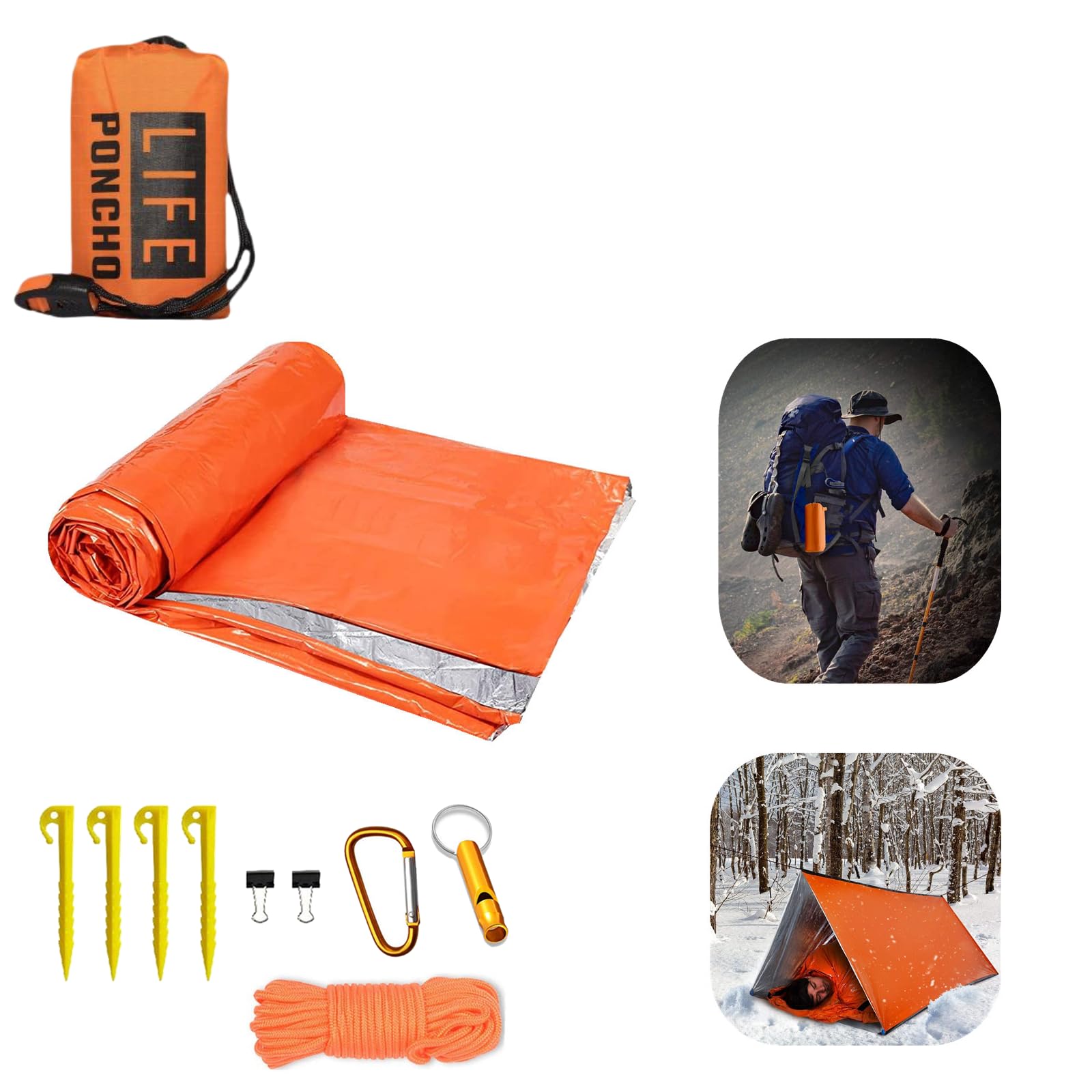 Details: Features:- Survival tent and is made of mylar with a tear resistant,puncture resistant coating,It's durable and reusable,so it can be folded and placed in a waterproof backpack,This emergency shelter heat reflective propertie in cold conditions insulated lining reflects 90% of body heat and helps insulate in extreme cold,It can be easily stored in the car,emergency first aid kit,and more.- 59*98.4inch Emergency survival tent comes with 4 stakes,1 paracord,1 drawstring pocket,1 carabiner,metal clips and 120-decibel emergency whistle. Specification:Color: Orange,GreenSize: 98.4 x 59 INMaterials: Polyester filmThe package contains:1 * Emergency tent4 * Stakes1 * Paracord1 * Binding Bag1 * Plastic Whistle1 * Carabiner1 * Metal Clips Warm Tips: Dear buyer,due to the light efficiency,monitoring brightness,manual measurement size,may occur 0 0.3mm error, is a normal phenomenon.There may be slight differences in color and size between photographs and real objects.I sincerely hope they can understand!Thank you very much! Satisfaction guarantee: Your satisfaction is our best effort,if you have any questions about our products,please contact us by email (attached picture),we will solve your problem within 24 hours.