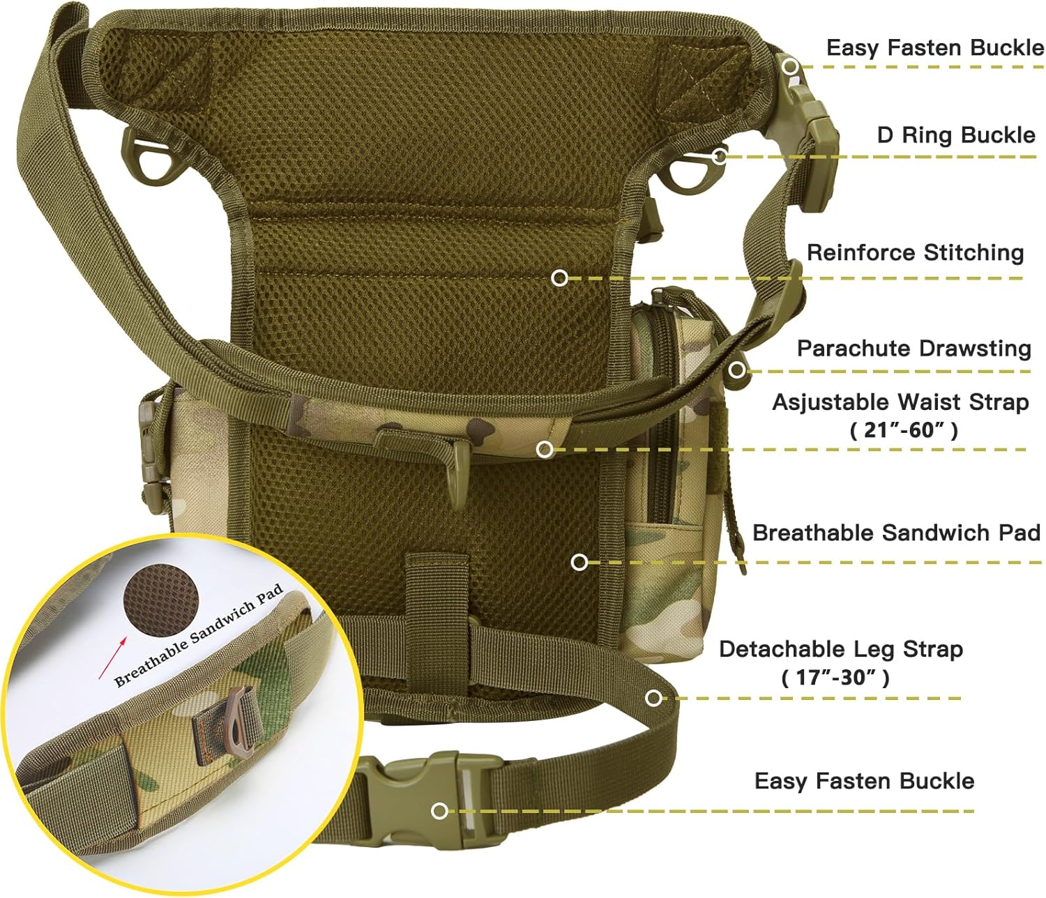 - ✅ EASY USE: Waist strap with 21’’-60” and detachable leg strap with 17’’-30” make it suit for different size people, and the buckles on the straps make this double leg drop bag easy to fasten and take off.