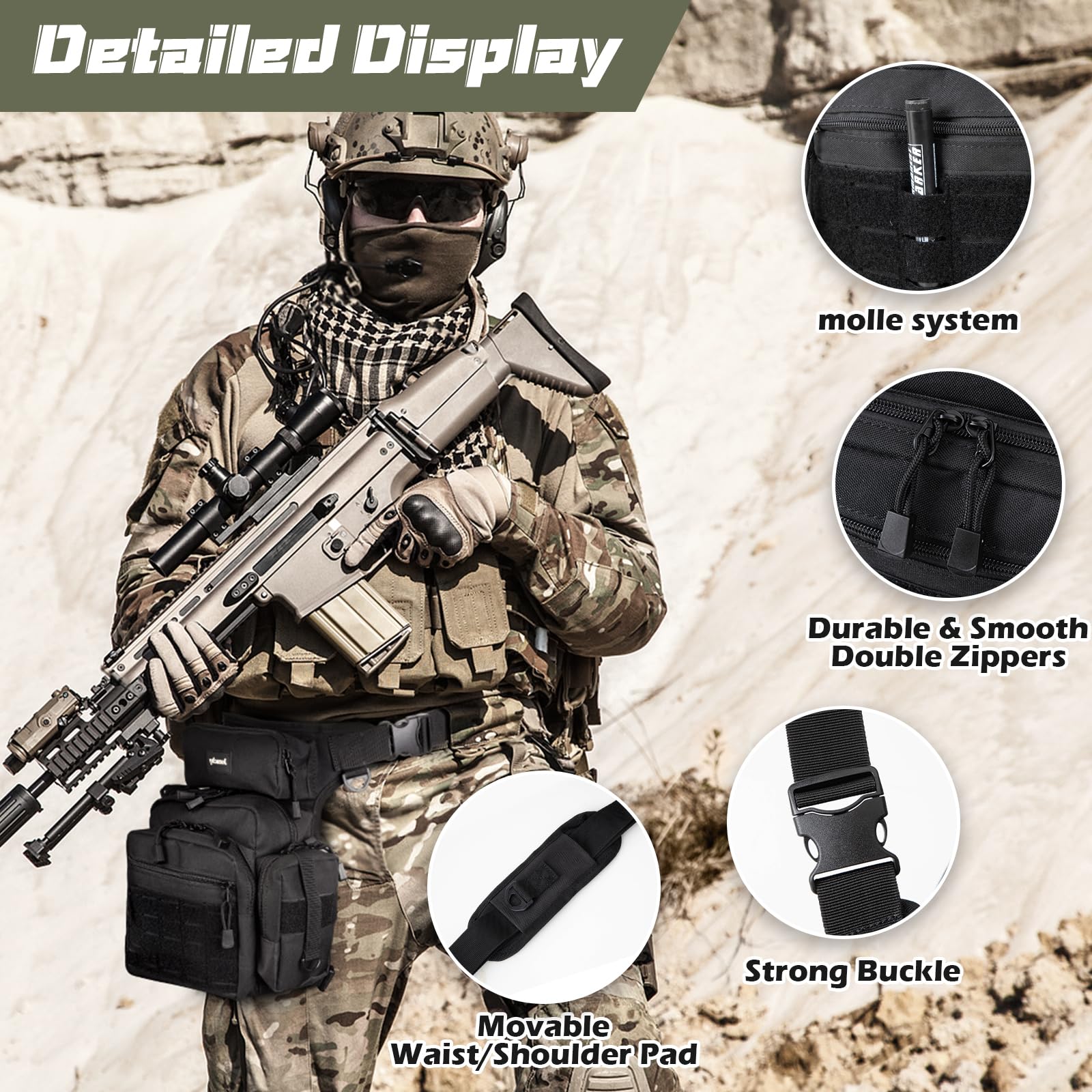 - 【THOUGHTFUL DESIGN】The tactical fanny pack for men is specially designed with a pocket to hold your glasses or sunglasses. Double-open zipper design, smooth zipper allows you to use it without any difficulty, easy to open and close. Wider waistband and shoulder pads can reduce pressure and more comfortable to wear. As a cool and large-capacity motorcycle leg bag, the jueachy drop leg bag can meet the space needed for traveling without adding to your burden