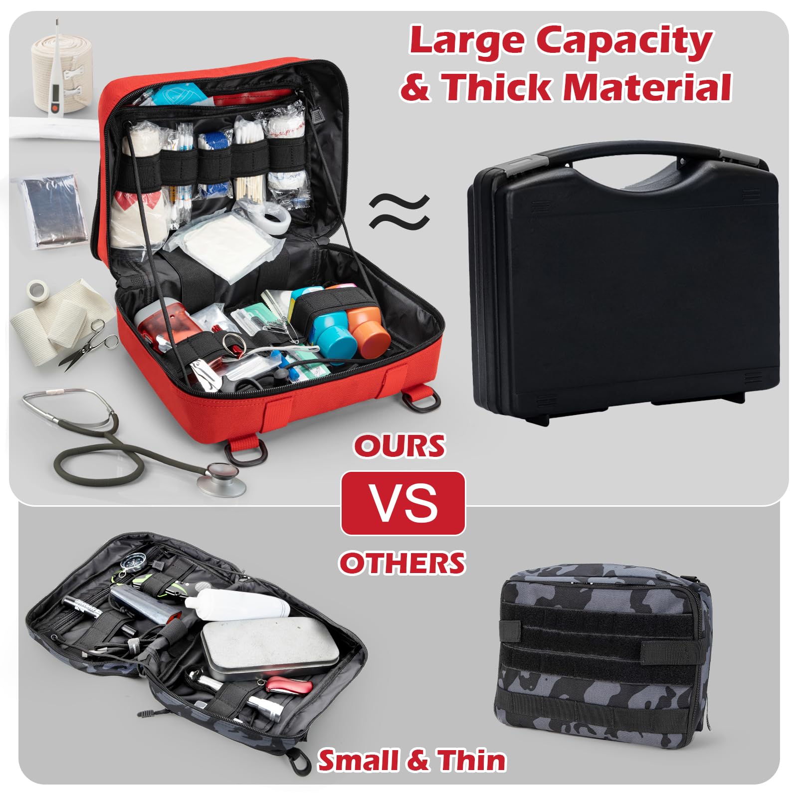 - ➕LARGE CAPACITY: The molle first aid pouch size 11.5''L×8''W×5''H. We optimized and upgraded this molle admin pouch large to expand the capacity based on the small problem that most customer reflected. Different from other small molle pouches, our molle pouch large can expand to the thickness up to 5'' in the state of full stuffing.