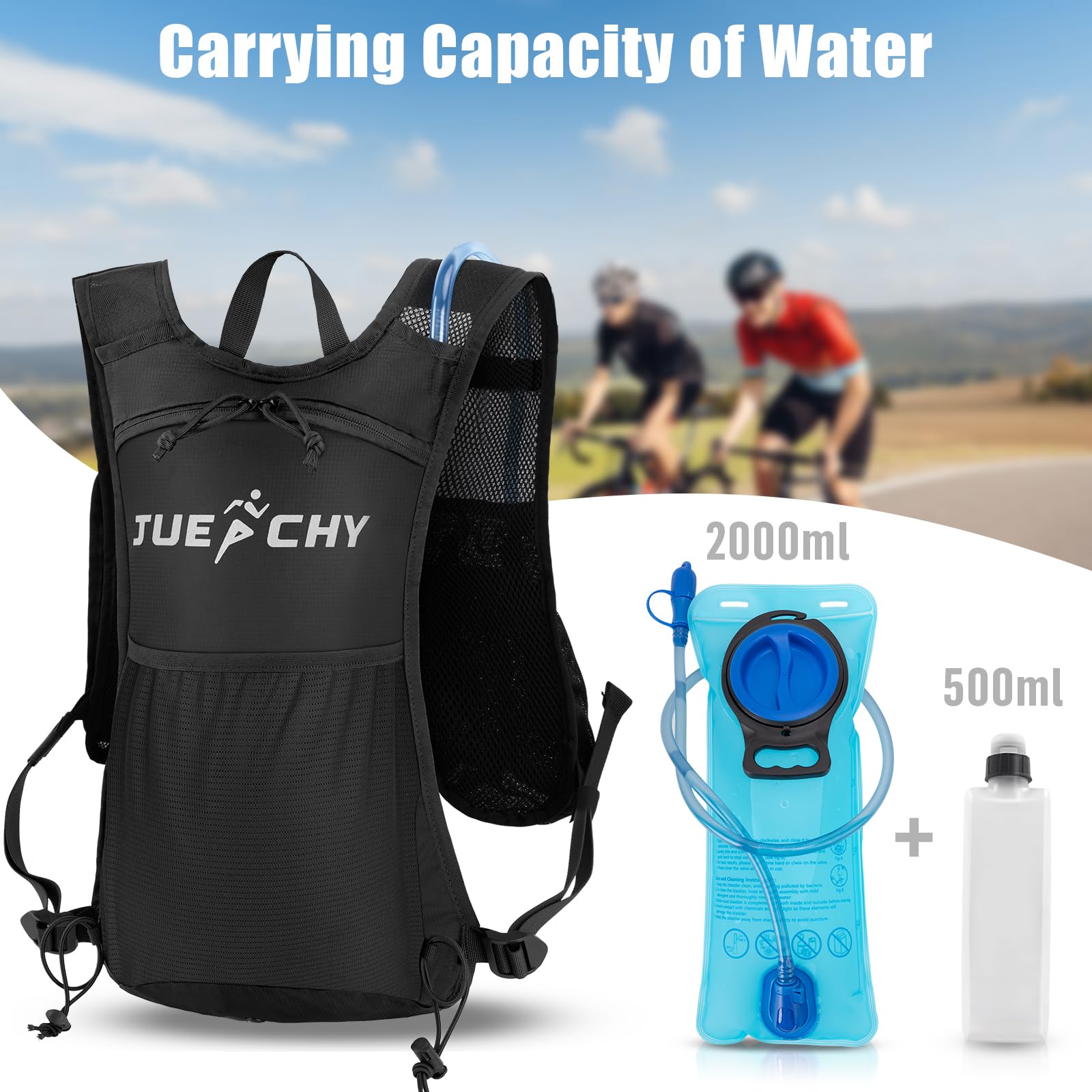 - 【Upgrade Leak-Proof】Equipped with a BPA-free 2L water bladder and and a large flow bite valve.The TPU water bladder has a large opening that can be easily filled with water and ice cube,as well as self-locking joints,ideal for long adventures-from camping trips to motorcycle tours