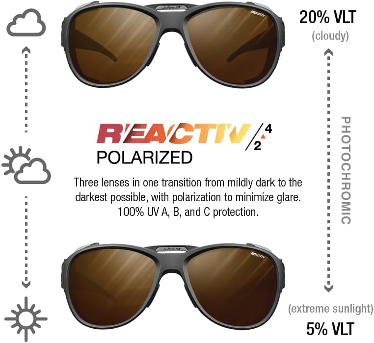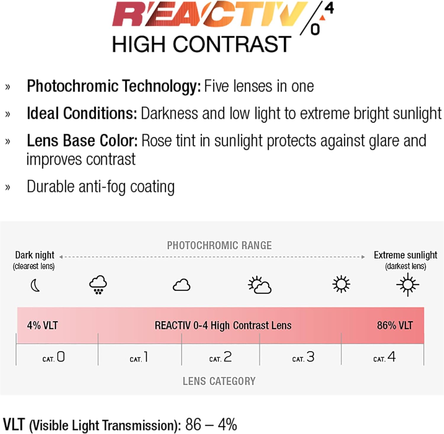 - REACTIV 2-4 POLARIZED LENS: Polarized, photochromic lens that quickly and automatically activates and adjusts based on changing light conditions. Features an antifog coating and enhanced protection from harmful glares, with 100% UVA, B and C protection. Suitable for high mountain sports. Visible Light Transmission Rate: 5% - 20%.