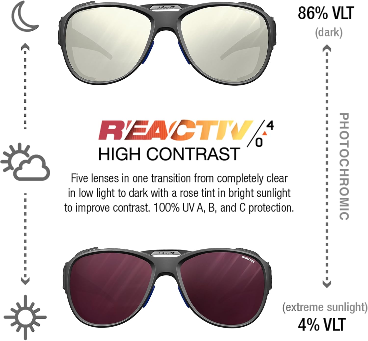 - INTENDED USE: The Julbo Explorer 2.0 was designed for both men and women for climbing and mountaineering and provides high performance, protection, and ventilation in a slimmer profile than its predecessor. Available with REACTIV & Spectron Lenses.