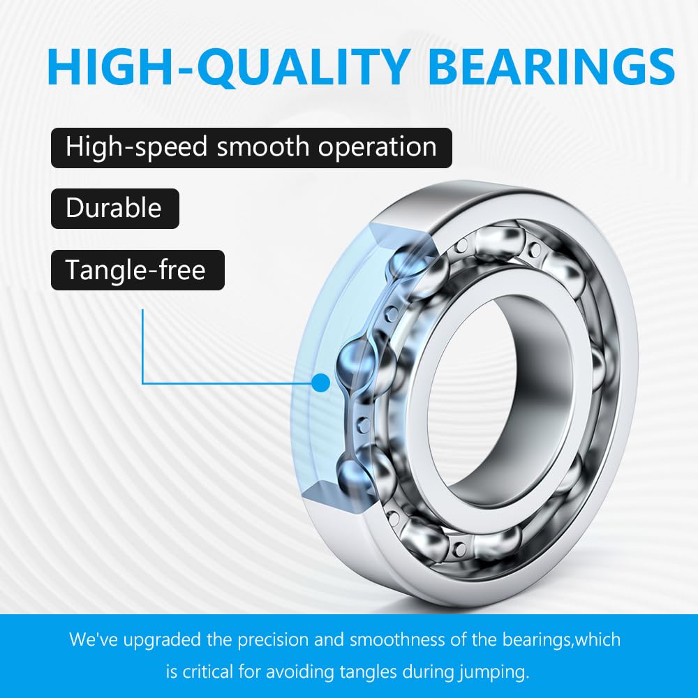 - 【POWERFUL BEARINGS REFUSE TO INTERTWINED】 The handle is equipped with high-speed ball bearings to ensure smooth and rapid rotation, effectively avoiding rope entanglement. The powerful bearings can make cross jump, double jump and other fancy jump ropes easier.