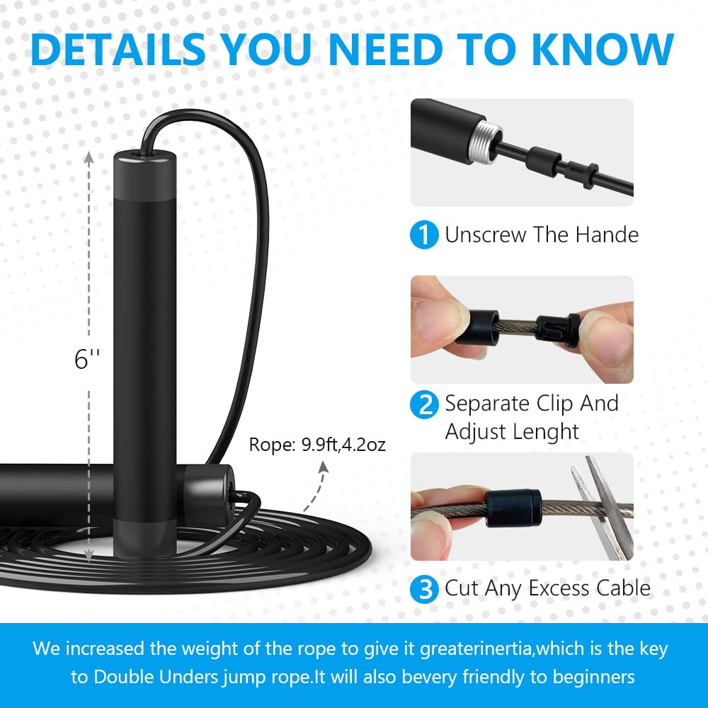 - 【WEIGHTDE ROPE JUMPS PERFECTLY】 We use a 5.0mm steel wire rope, which weighs an astonishing 4.2oz and is the foundation of high-quality jumping,Whether you're a boxer, a regular trainer for cardio, crossfit, or just jump for weight loss, this is the perfect beginner's weighted jump rope.