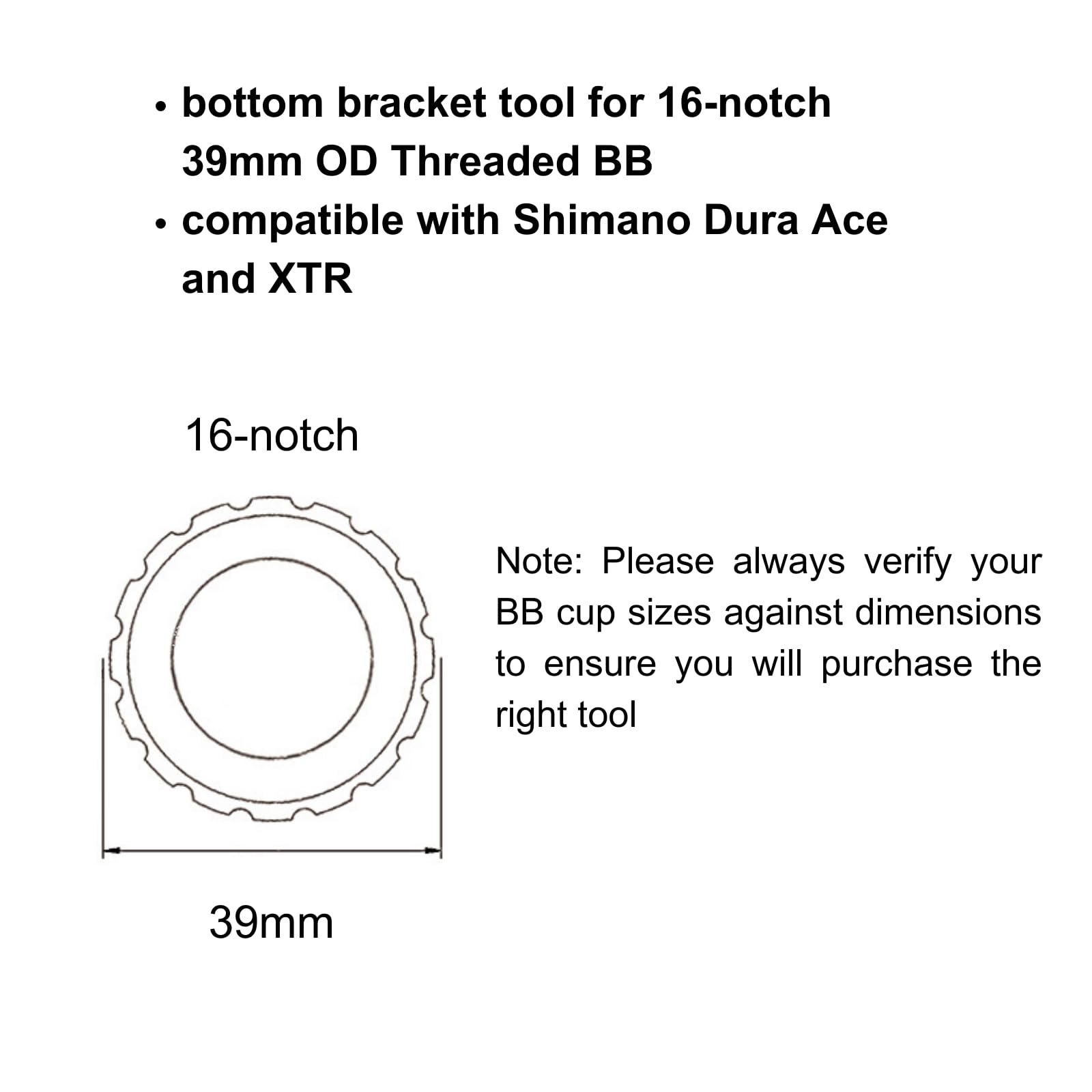 - Compatibility: Expertly designed for 16-notch 39mm OD Threaded BB, it fits bottom brackets like Shimano Dura Ace and XTR (Note: Please always verify your BB cup sizes against dimensions shown on listing to ensure you will purchase the right tool)