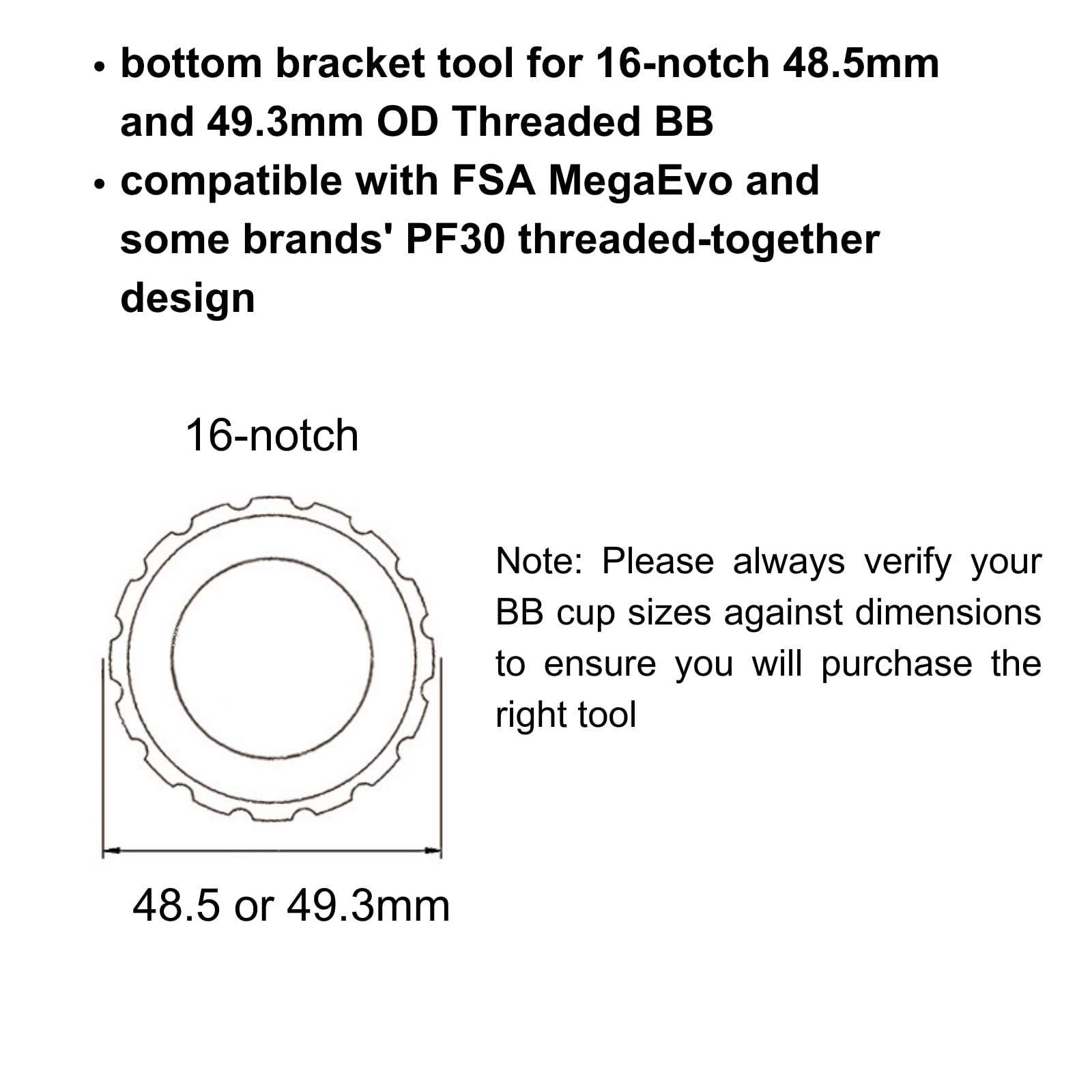 - Compatibility: Specially designed for 16-notch 48.5mm and 49.3mm OD Threaded BB, it fits bottom brackets like FSA MegaEvo and some brands' PF30 threaded-together design (Note: Please always verify your BB cup sizes against dimensions shown on listing to ensure you will purchase the right tool)