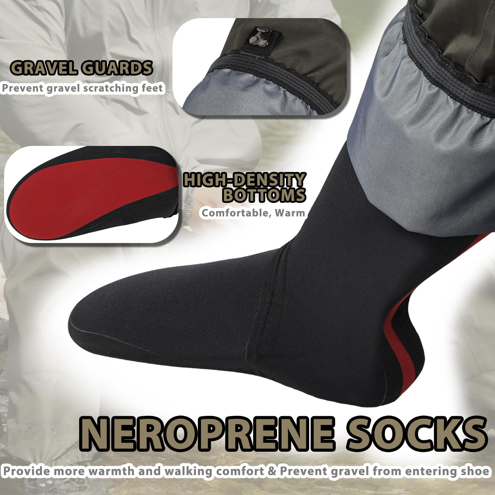 - GRAVEL GUARDS --- The waist waders 4mm neoprene socks with high-density bottoms provide more warmth and walking comfort. Gravel guards with boot lace hooks can be used with fishing shoes to prevent gravel from entering the shoe and scratching the feet