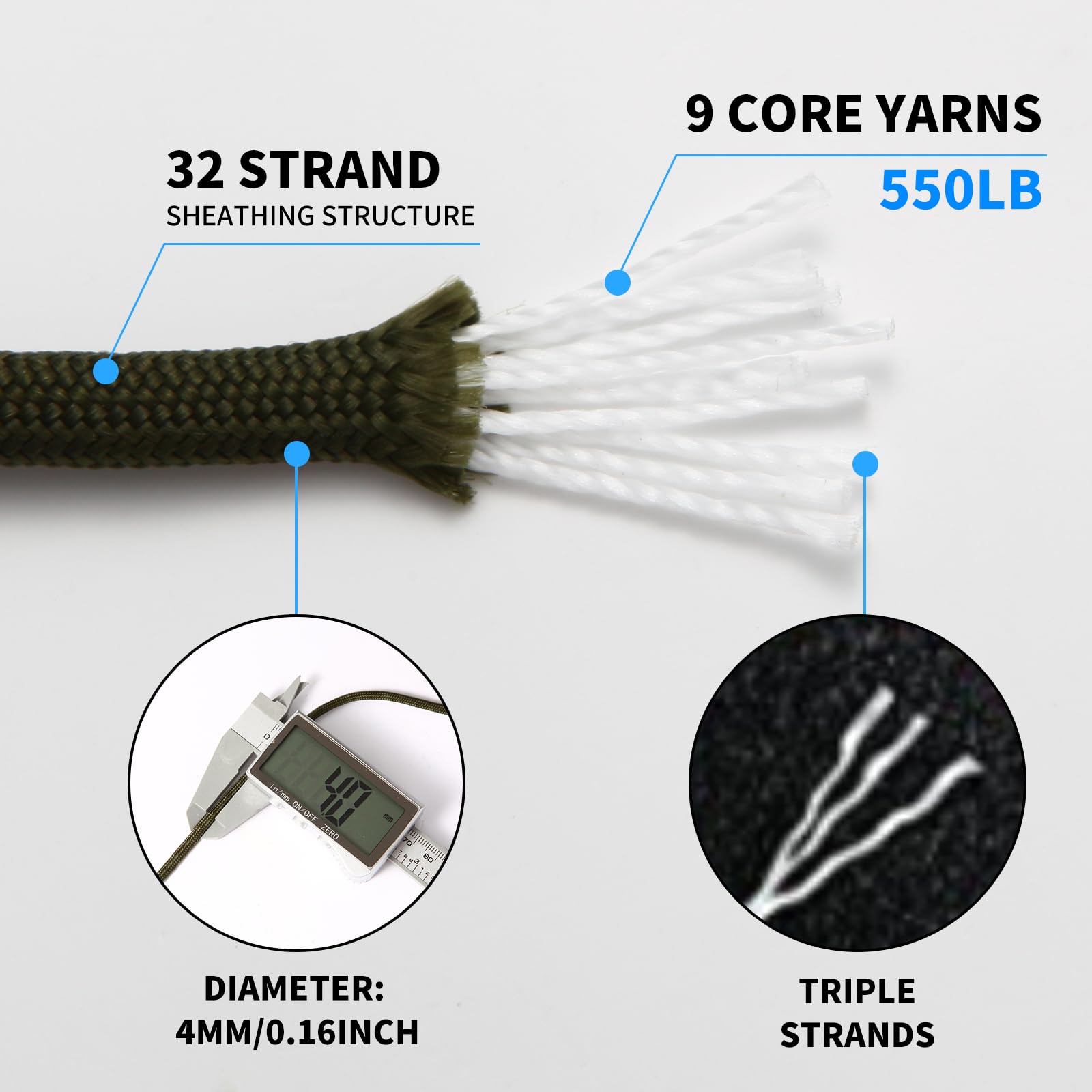 - 550Lb PARACORD: Paracord has 550 LB Tensile Strength. It is strong, strength, reliable and long time life. Paracord diameter is 0.16 inch (about 4mm). 9 Strand inner core, each core have 3 layers of twisted yarn