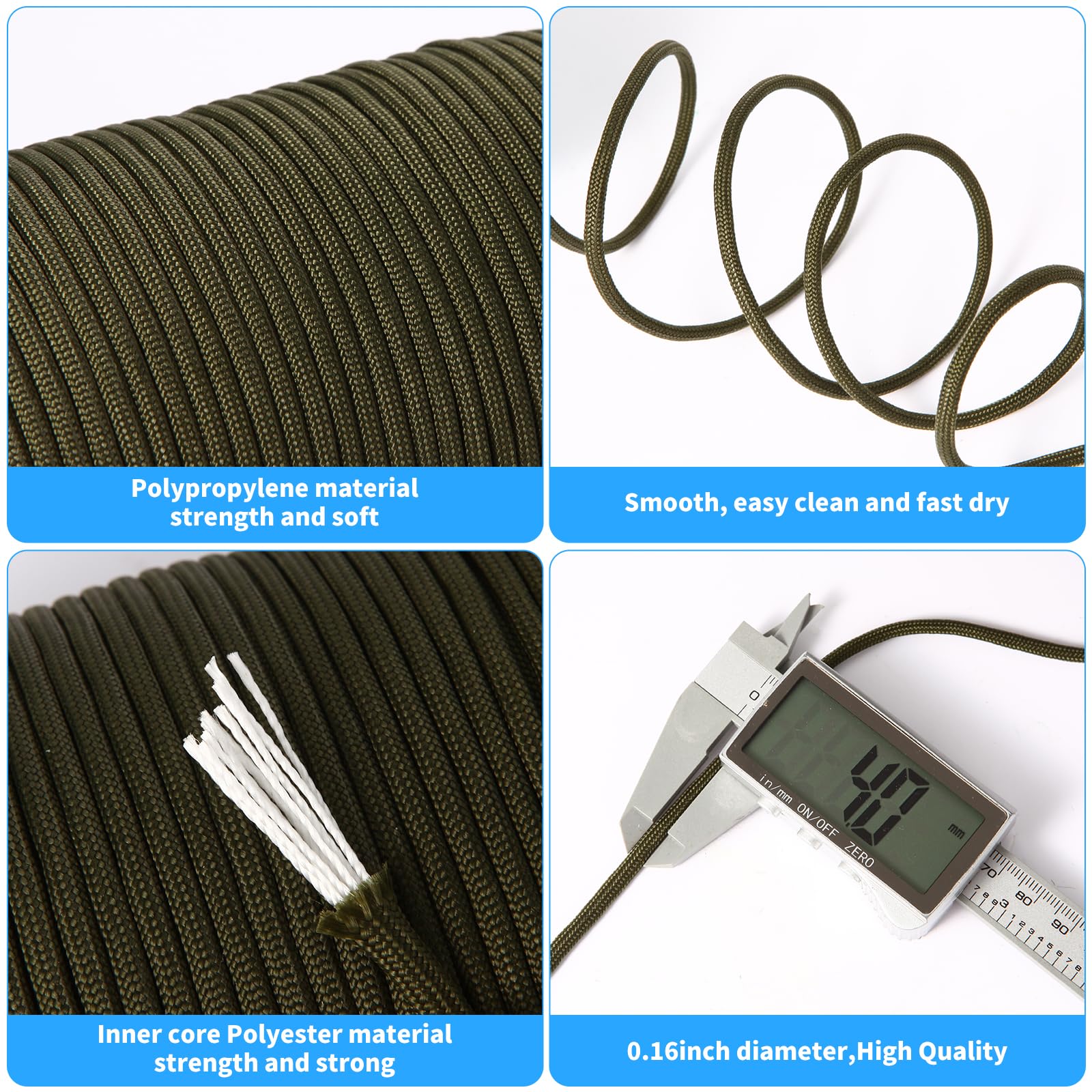 - HIGU-QUALITY PARACORD: Outer material is Polypropylene, strength and soft. Inner core material is polyester, it includes 9 strand white core. it is easy clean,knot and fast dry