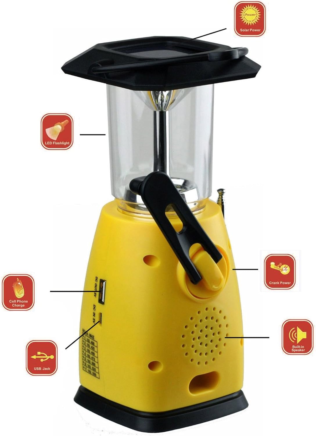 - Multi-functional solar / hand crank LED camping lantern with AM/FM NOAA weather radio & cell phone charger