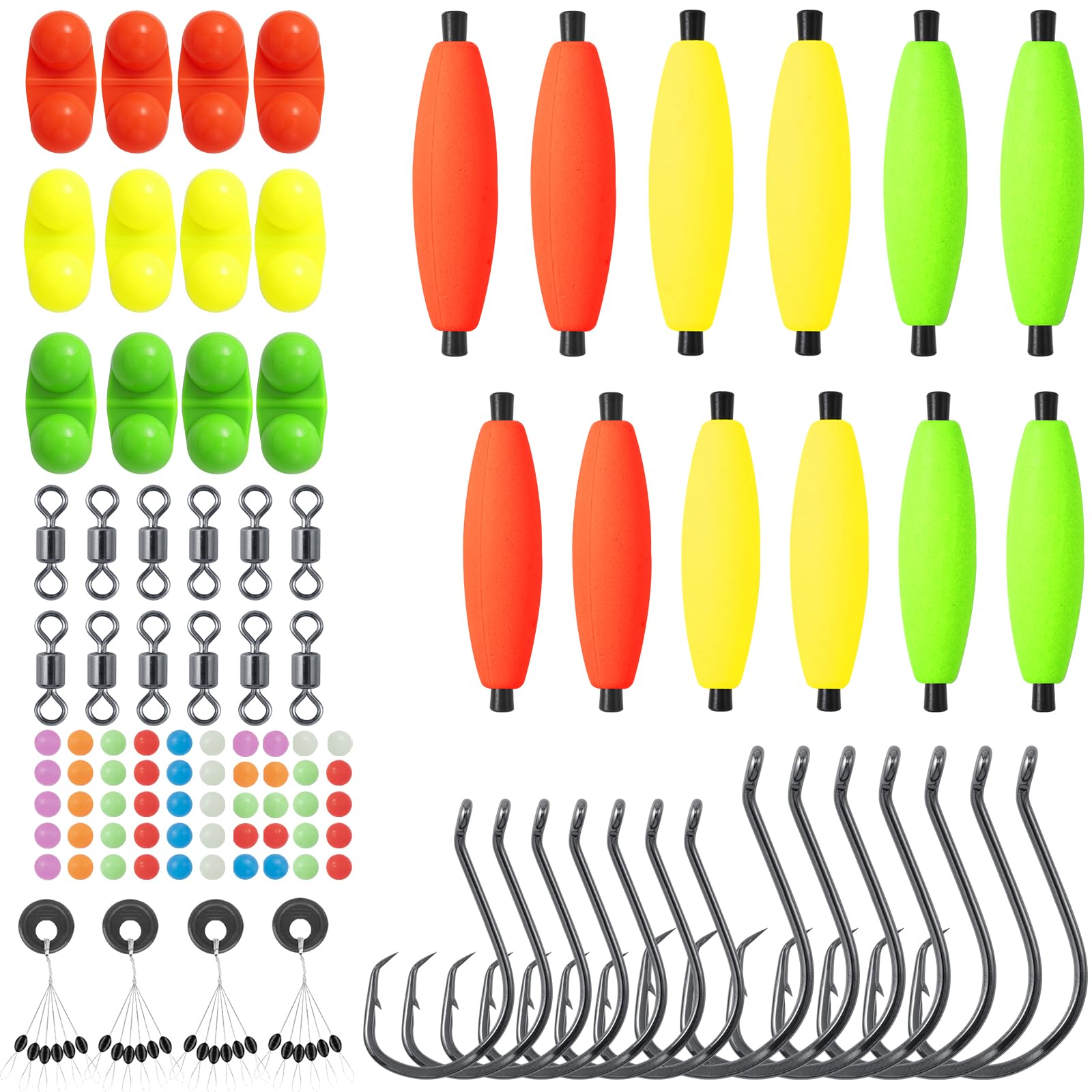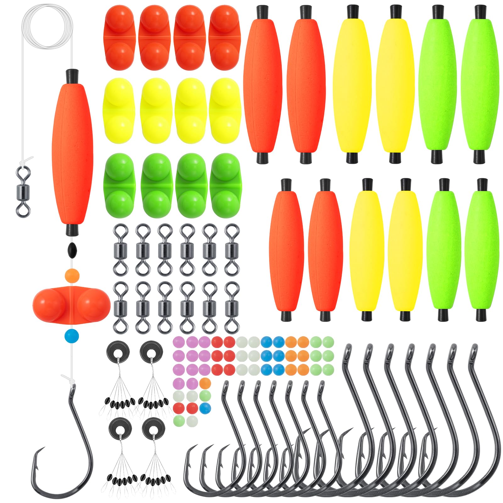 - (Type A) 104PCS CATFISHING TACKLE MAKING KIT INCLUDES: EVA peg float * 12pcs/3 colors/2 sizes(2.5in,3in), offset circle hook * 14pcs/2 sizes(6/0,8/0), fishing bell * 12pcs, bobber stopers * 4sets(24pcs), barrel swivels * 12pcs(95LB), fishing beads * 50pcs. Cost-effective catfishing making kit. Catfish rig is popular for drift fishing, trolling fishing and anchored fishing. NOTE: Fishing Weights and Fishing Line are NOT INCLUDED in the package.