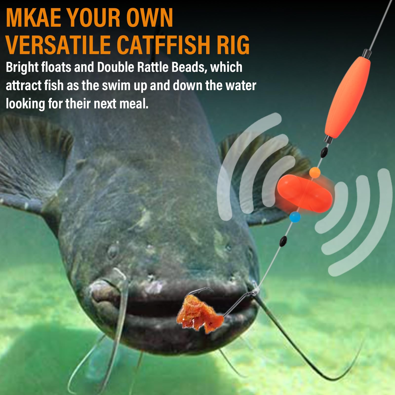 - MAKE YOUR OWN CATFISH RIG: Catfish have poor visual but have a sensitive sense of auditory and taste. Our rattling-floats are equipped with 3D Lifelike Eyes, bright vibrant painted and buit-in steel ball. Plastic sinker slide can protect fishing lines and knots. The rattling-float catfish rig attacks the catfish's soft spot from the visual, auditory and taste senses, helping you to catch more catfish!