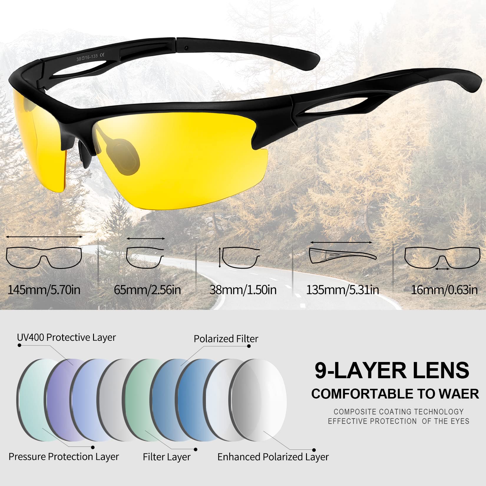 - UV400 protection: KANASTAL sports sunglasses all have UV protection function, which can effectively block harmful light and protect eye health. UV400 protective night vision goggles are crucial for protecting the eyes from long-term UV damage and maintaining eye health