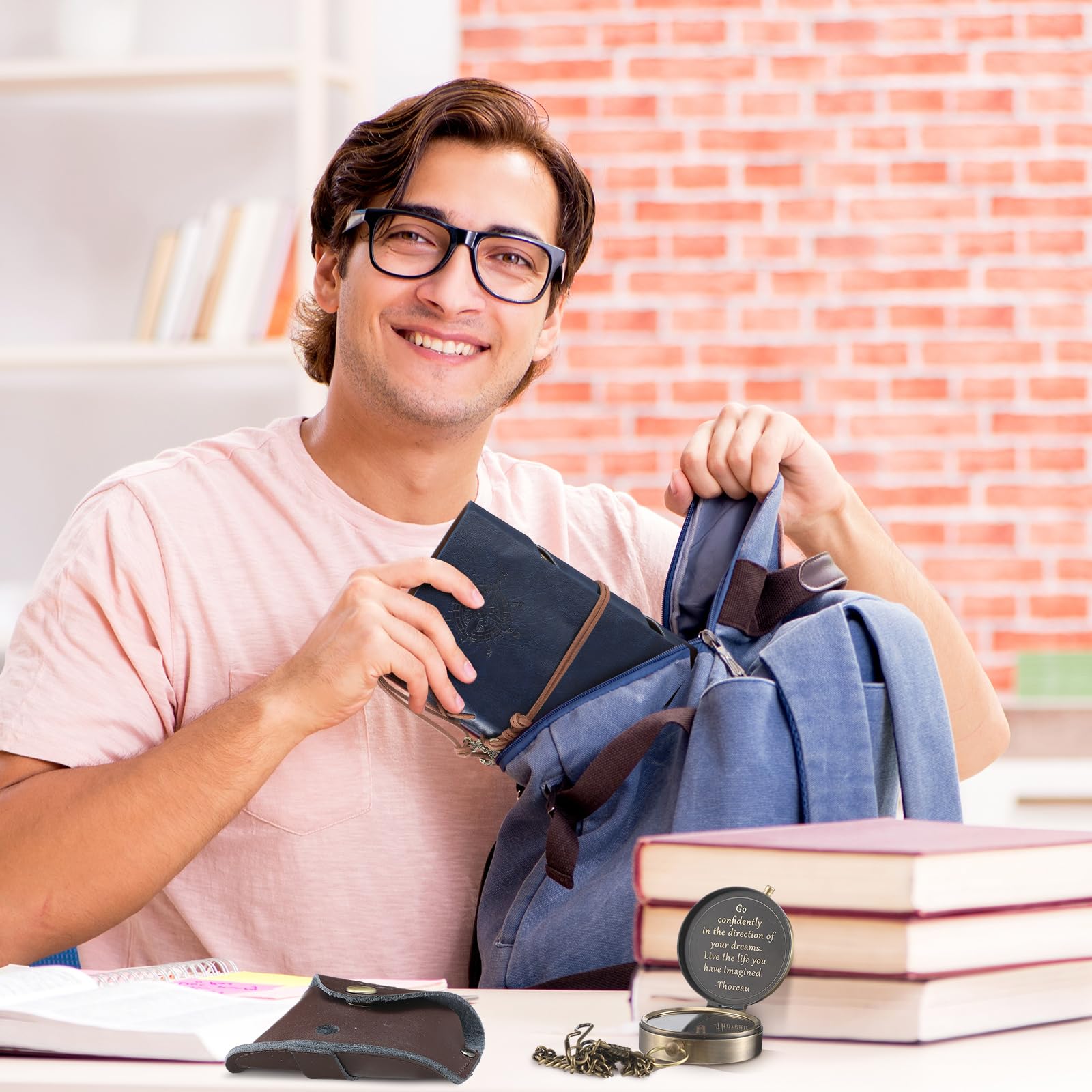 Kanayu 2 Pcs Compass Graduation Gift Compass with Stamped Leather Case and Leather Journal Notebook High School College Graduation Gifts for Him(Dark Blue)