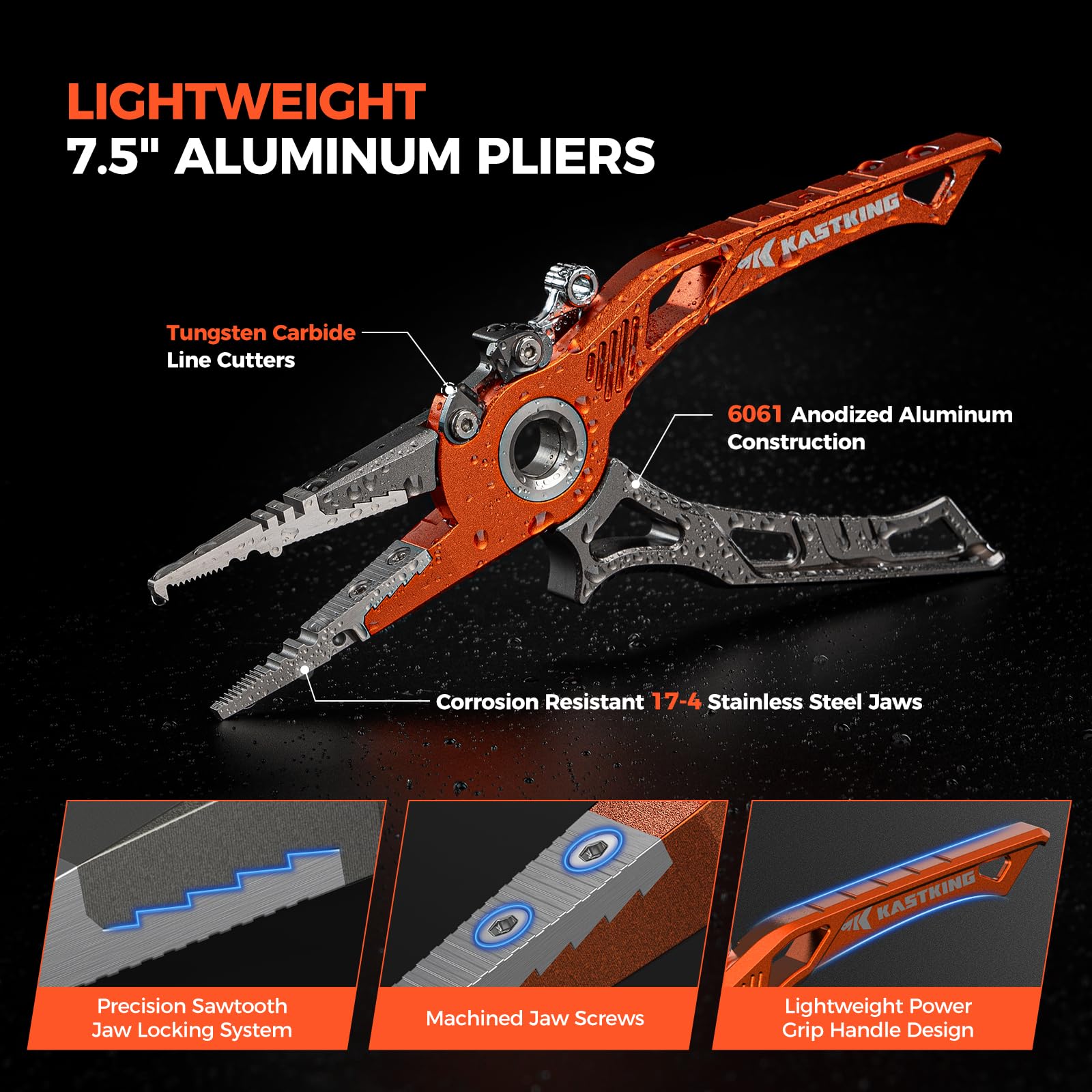 - Ultra-Durable & Corrosion-Resistant Build – Made from high-strength, lightweight 6061 anodized aluminum, the KastKing AlumaStream 7.5" Aluminum Fishing Pliers are perfect for both freshwater and saltwater fishing. The precision-machined body ensures long-lasting performance in tough environments