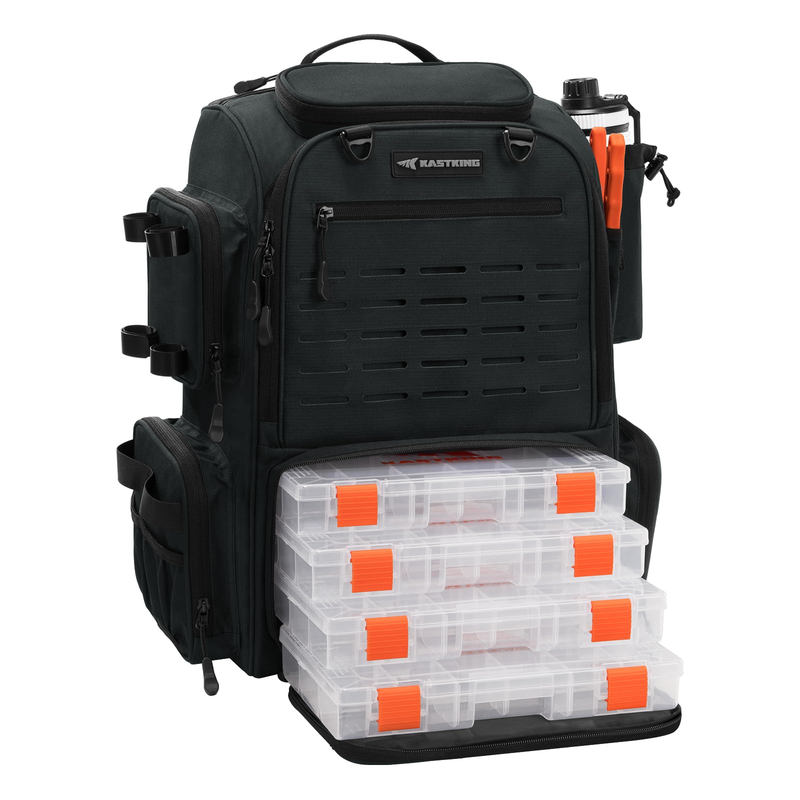 - ADJUSTABLE MAIN COMPARTMENT: This fishing backpack has a 45-liter large-capacity storage compartment. The main storage area is easily adjustable with a foldable padded divider in the middle. You can fold down the divider on the main compartment and snap it into place to obtain two equally sized storage spaces. The upper layer holds clothing and snacks, while the lower layer holds four 3600 KastKing tackle boxes (included).
