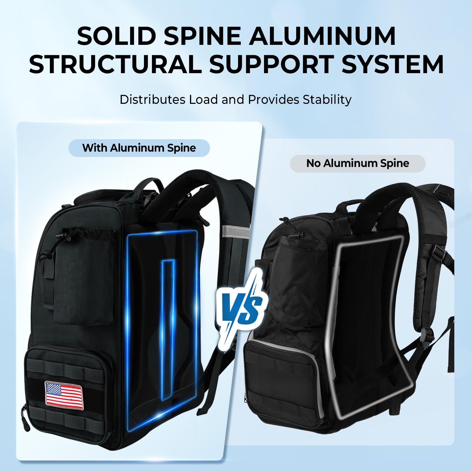 - ADVANCED BACK SUPPORT SYSTEM: Bait Boss Pro Fishing Backpack boasts an unparalleled level of comfort and support. The built-in SolidSpine Aluminum Structural Support System distributes the load and provides stability. Combined with breathable material and thick comfortable padding, this system ensures superior comfort during extended wear.