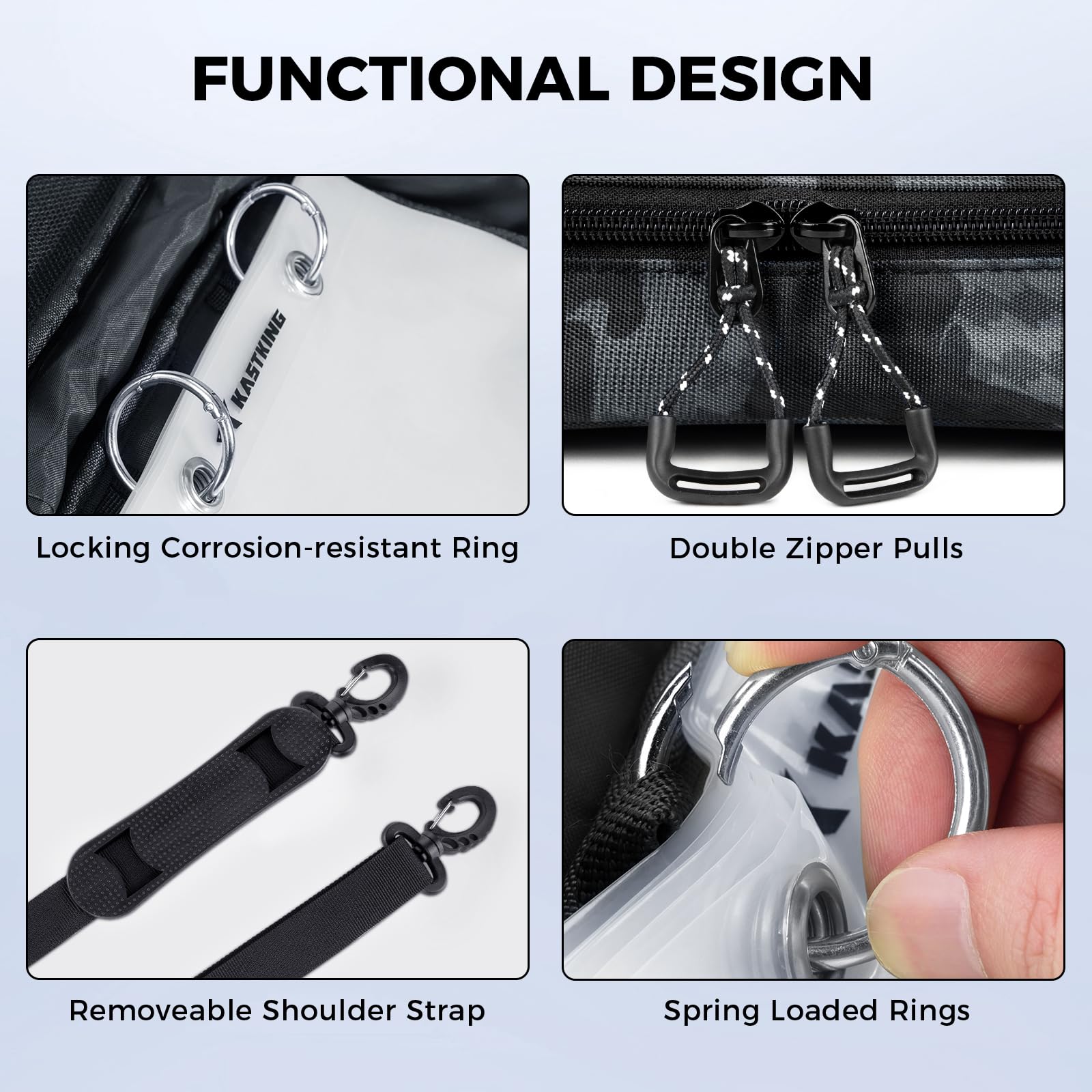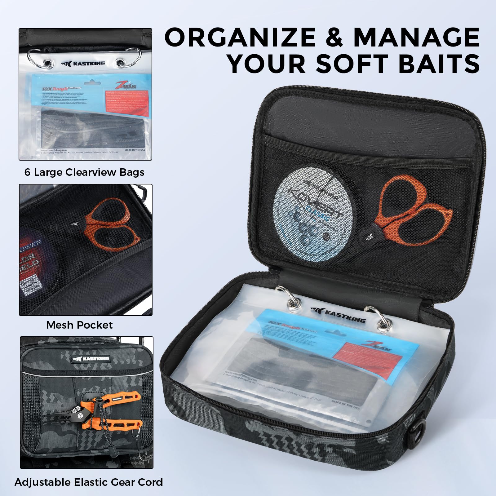 - Large Clear Sleeves for Easy Access – KastKing BaitSpace detachable soft bait binder bag includes 6 heavy-duty clear plastic sleeves (9.5” x 7.5”), 69% larger than competitors, with durable metal grommets for quick bait access and organization