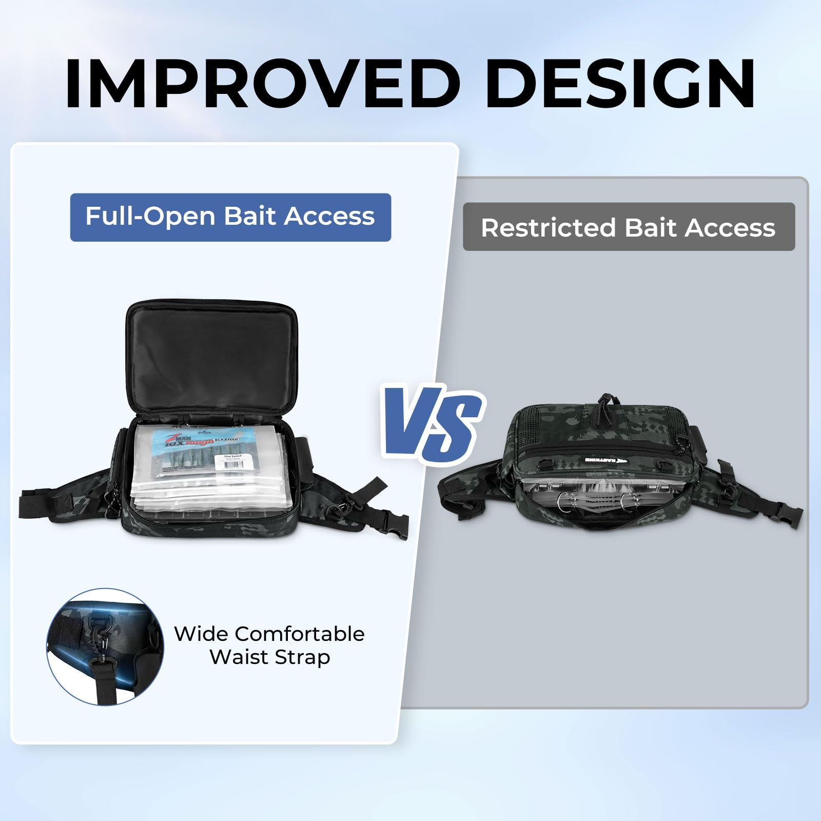 KastKing BaitSpace Waist Bag – Waterproof Tackle Storage Bag With Adjustable Belt, Fishing Fanny Pack for Men, Soft Bait Organizer, 3600 Utility Box, Rod Holder, Nylon, Black Camo