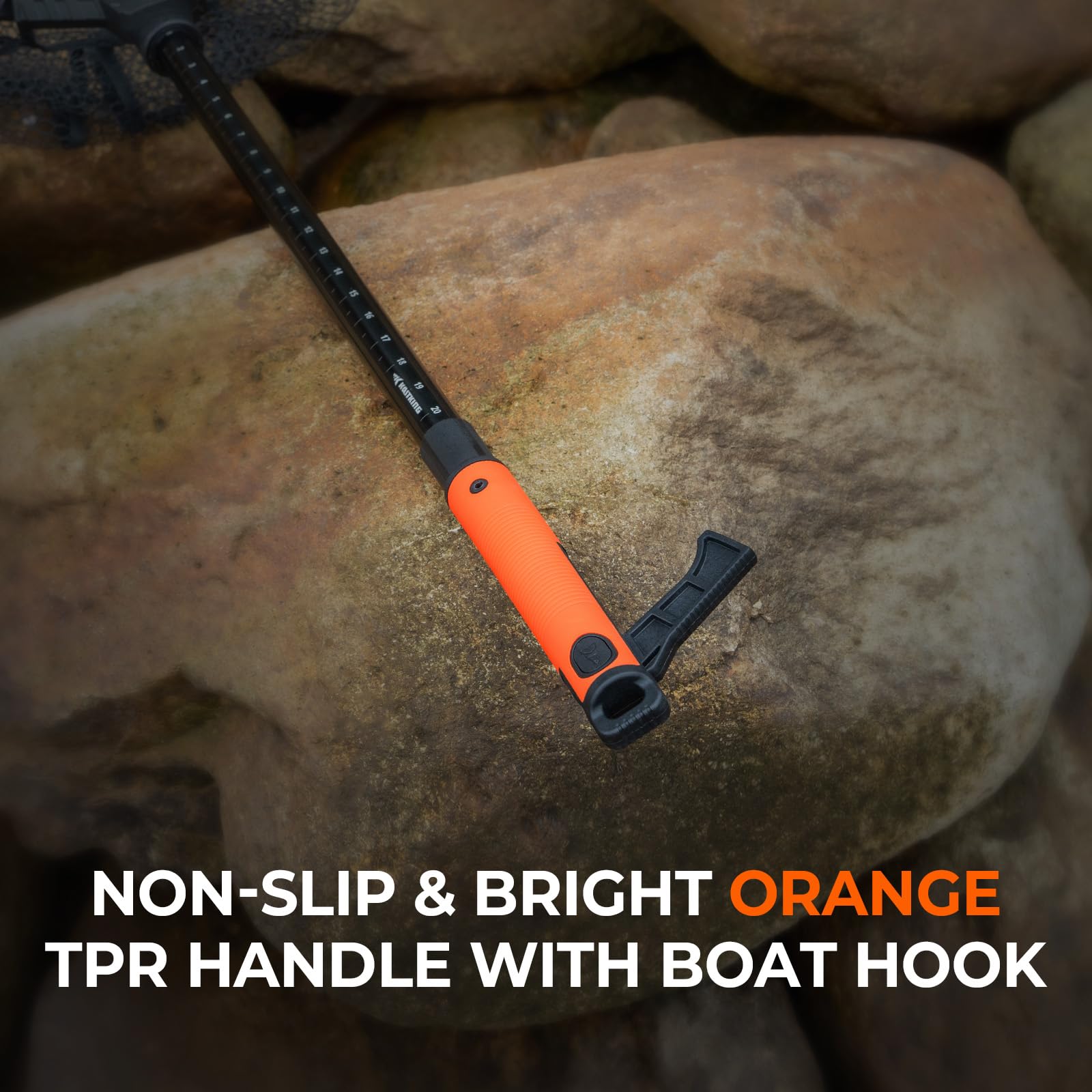 - Bright Color TPR Handle with Built-in Boat Hook: The bright orange non-slip TPR handle ensures quick visibility in low light and provides a comfortable, firm grip that prevents slipping. The handle features a multi-functional boat hook, which can be easily activated or deactivated with a single button press, making docking easy, retrieving objects safely, and clearing obstacles. With a pull strength of up to 220 lbs, it provides robust performance for various tasks.