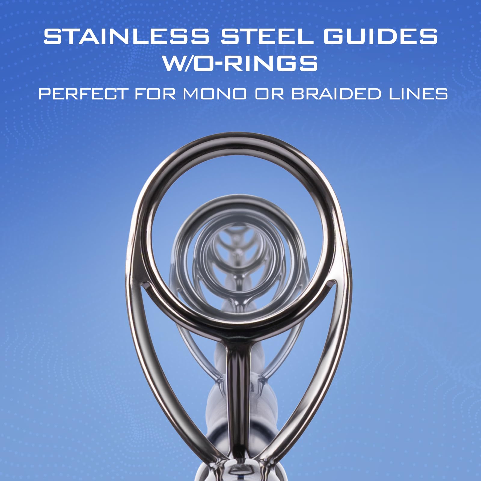 - Stainless Steel Guides w/O-Rings – Strong and durable stainless-steel guides are used on all models with premium O-ring inserts that perform perfectly with both mono or braided lines. The lightweight stainless frames look great and keep the weight down for a perfectly balanced rod blank.