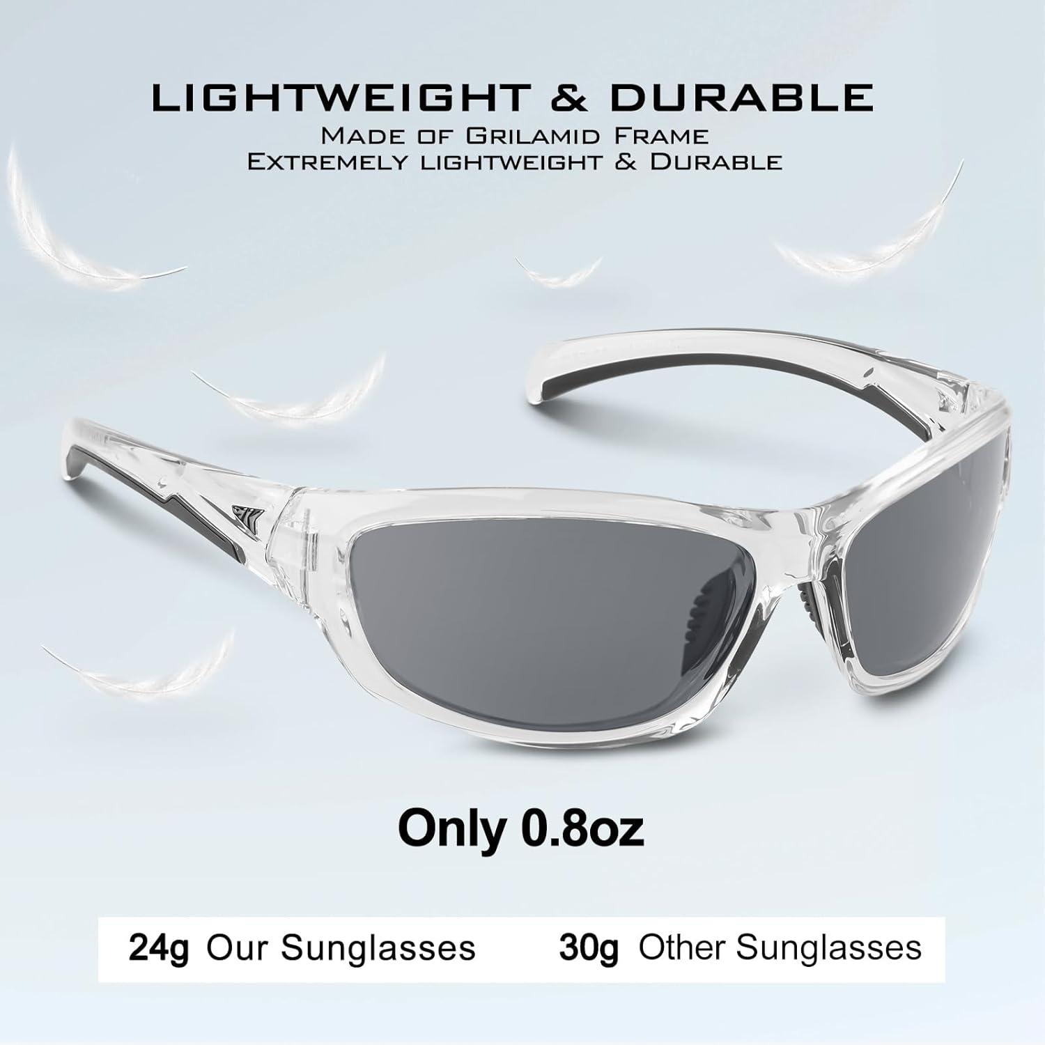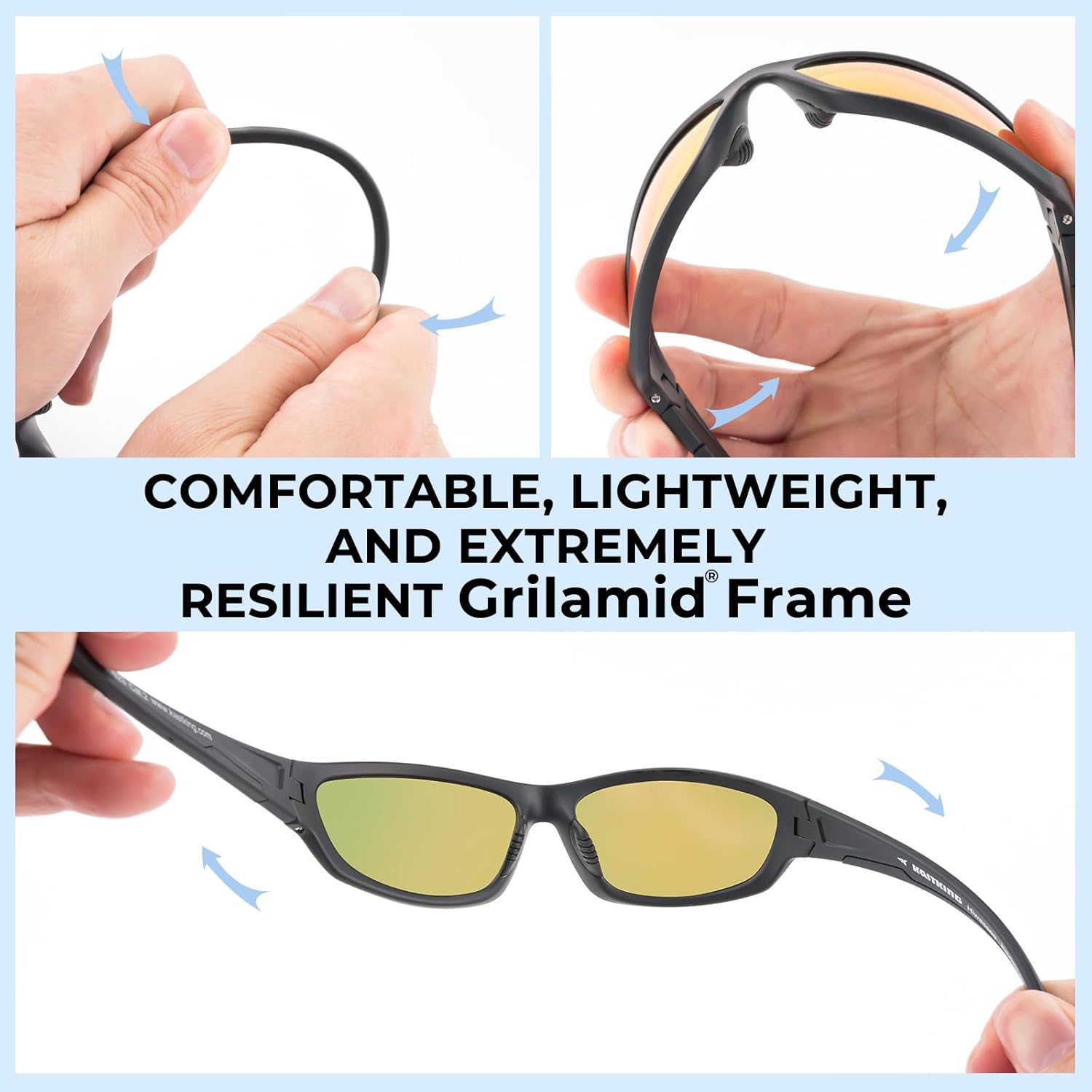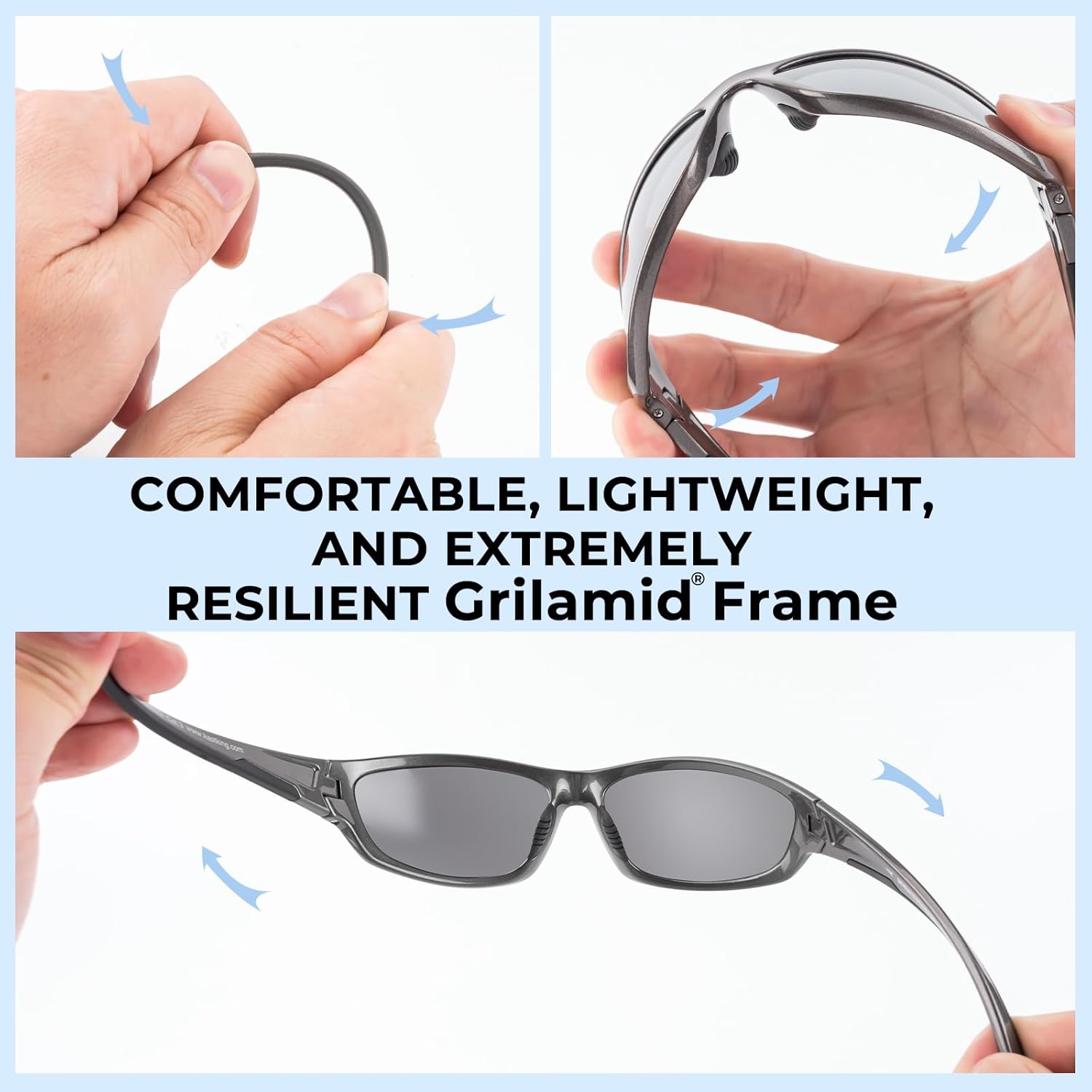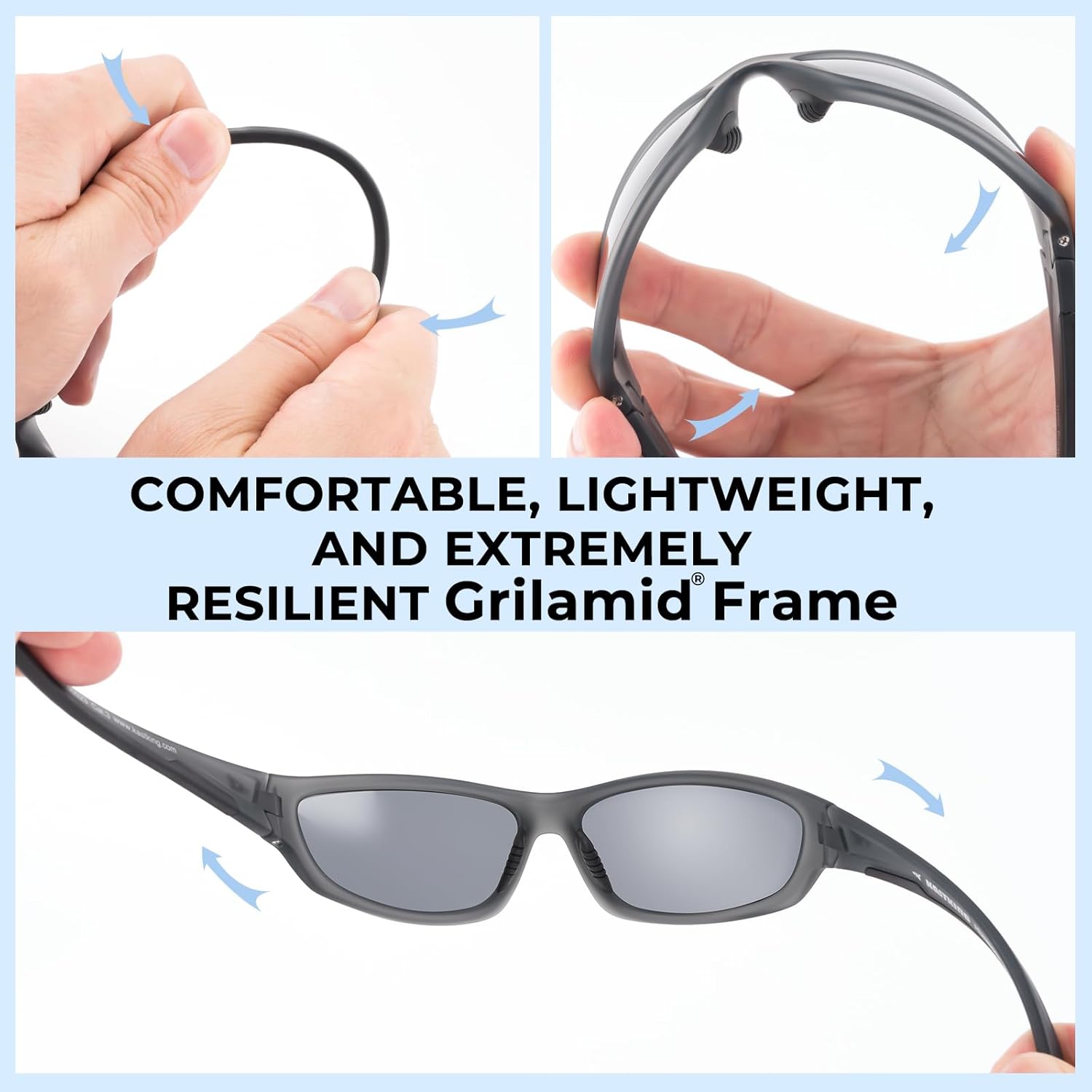 - KEY FEATURES - Polarized lenses reduce glare - Impact resistant TAC lenses protect your eyes from flying objects - Lightweight, durable, and comfortable Grilamid frames – Anti-slip nose and temple pads - Block 100% of the harmful UVA and UVB rays