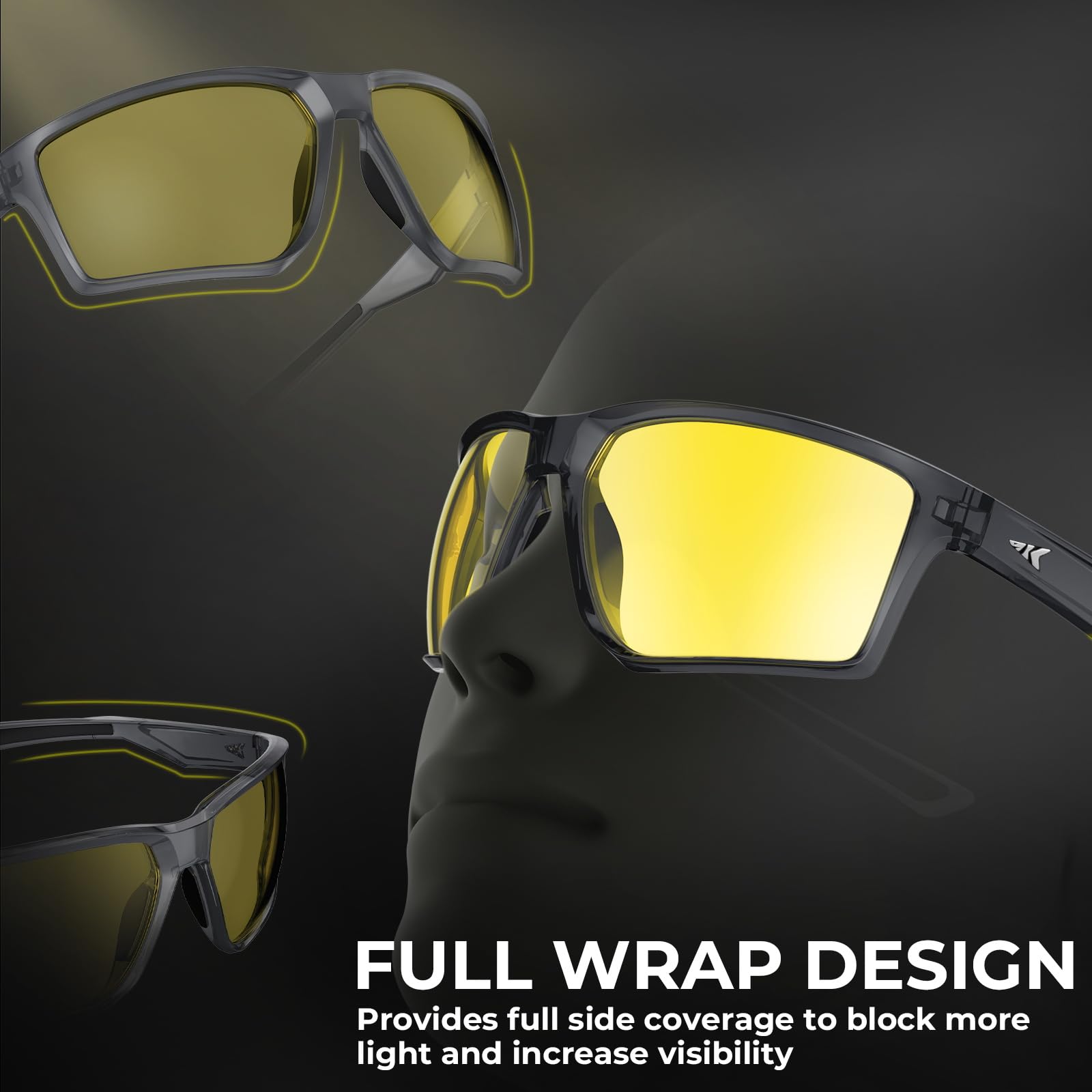 - Enhanced Night Vision Glasses - Experience improved visual clarity and depth perception with the KastKing yellow lenses, specially designed for night and low light vision, as well as rainy or foggy conditions. KastKing night driving glasses provides superior durability and increased visual clarity.