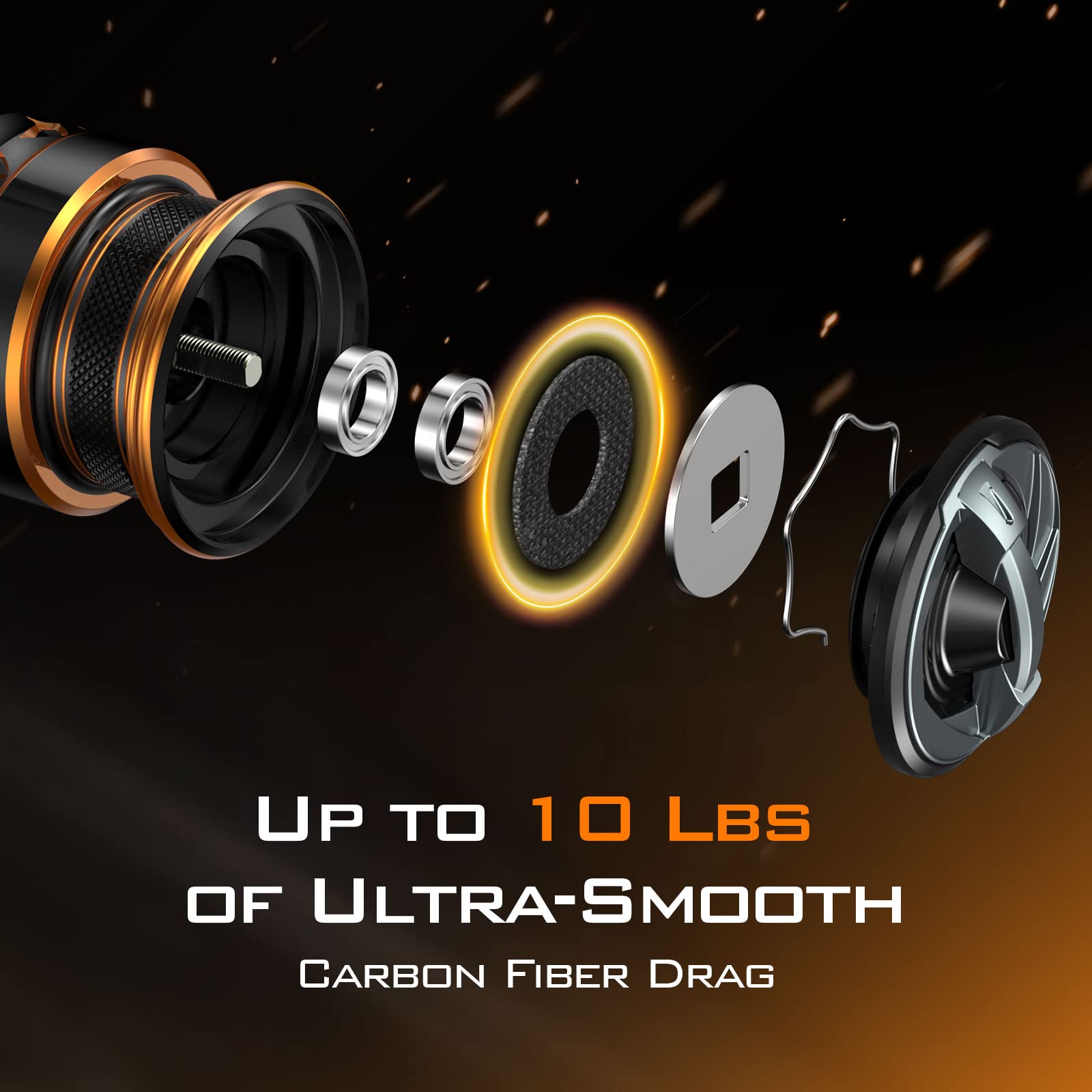 - 【STRENGTH WITHOUT THE WEIGHT】 The carbon fiber drag washers deliver 10 lbs of smooth stopping power and the reel is built with a 7075 aluminum main shaft & 2014 aluminum drive gear, solid brass pinion gear, and a shallow cut CNC 6061 aluminum braid-ready spool.