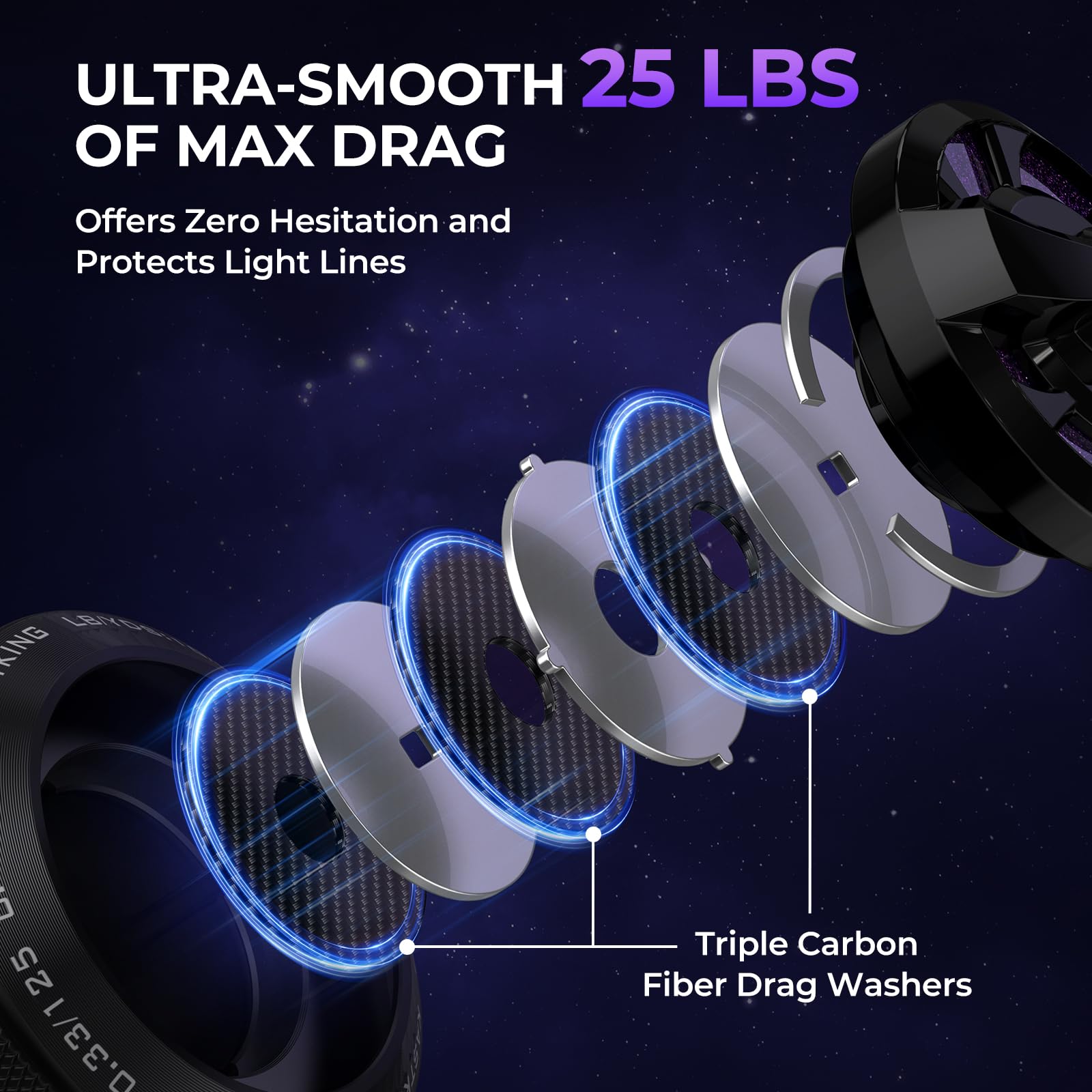 - High Strength yet Lightweight: Crafted with a lightweight yet high-strength carbon fiber construction, the Royale Legend Pro Spinning Reel cuts weight while not skimping on power. Its Triple Carbon Fiber Drag System provides up to 25LB of incredibly smooth drag, offers more than just power; and the Royale Legend Pro Spinning Reel guarantees zero hesitation, ensuring the protection of your light lines while fishing.