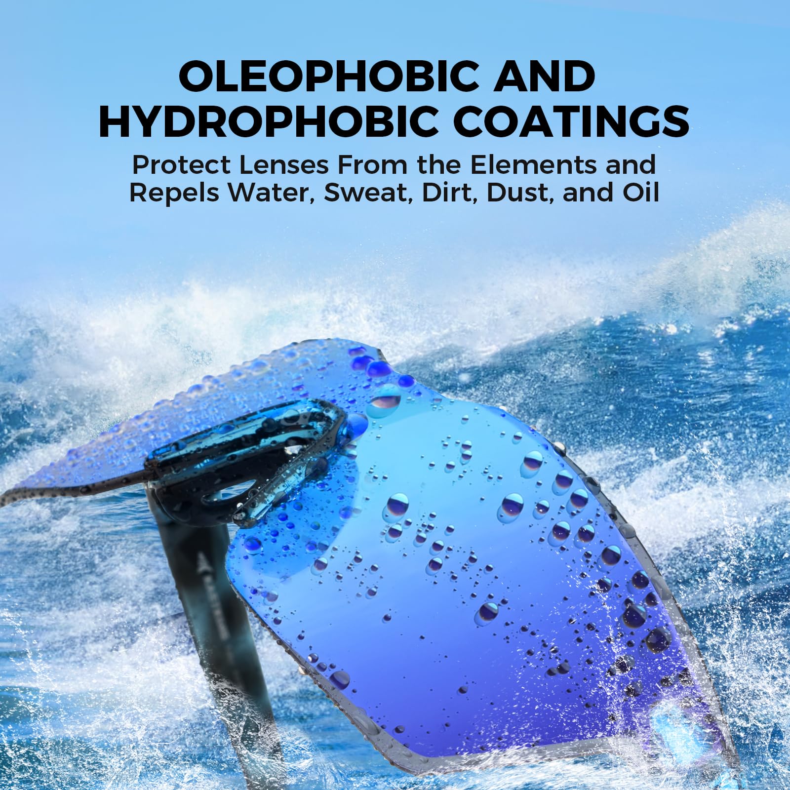 - KEY FEATURES – Clear unobstructed view one-piece polycarbonate (PC) lenses for fishing, running, and cycling, offering superior optical clarity and durability compared to TAC lenses, Polarized lenses reduce glare, Oleophobic lens coating repels oil, chemicals and saltwater, Rimless wrap design, Lightweight, durable, and comfortable Grilamid temples, Non-slip nose pads and temple pads, Block 100% of harmful UVA and UVB rays.