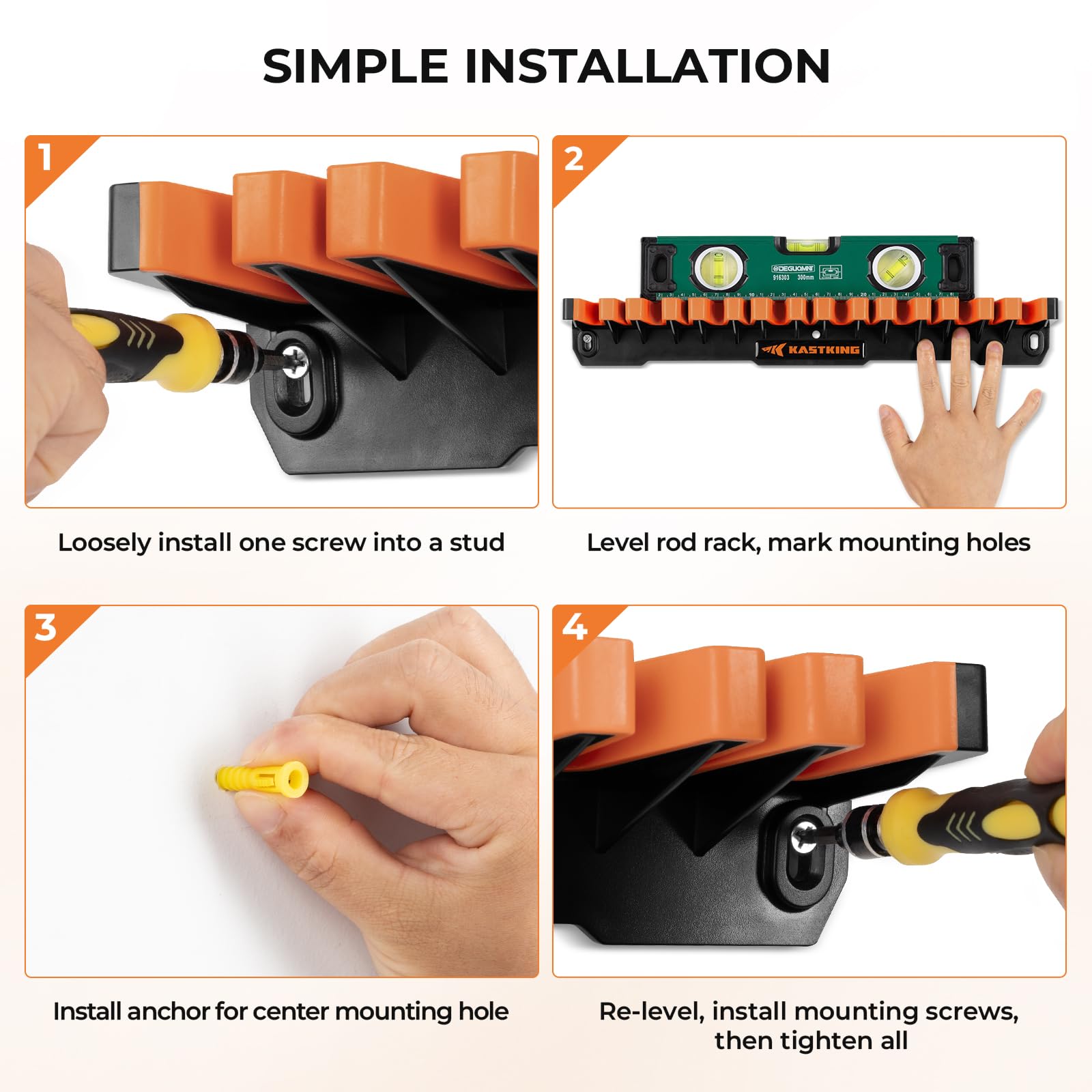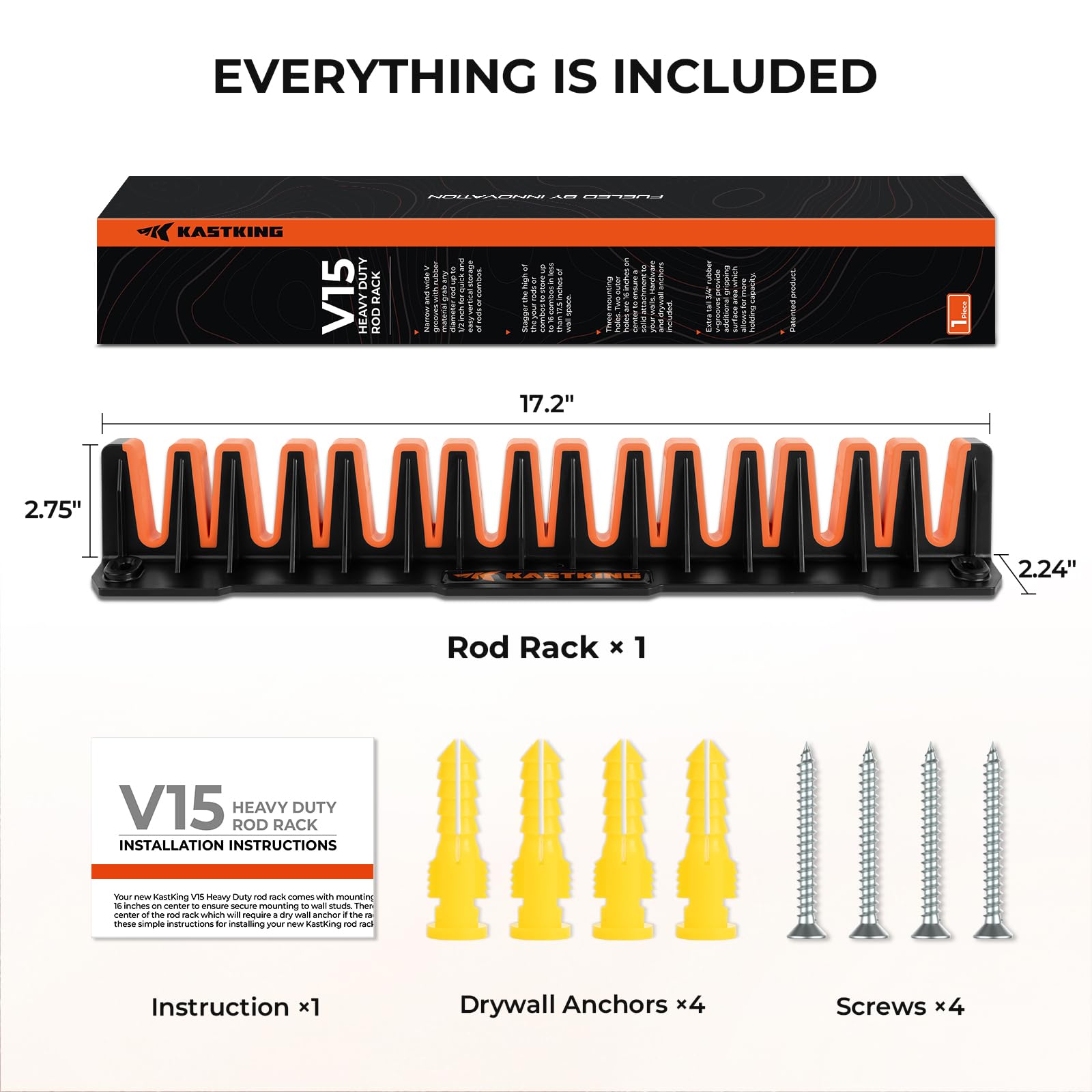 - SIMPLE INSTALLATION – KastKing V15HD fishing rod racks have 3 mounting holes. 2 outside holes are 16” on center for secure installation on standard-spaced wall studs. To install the rack, determine the correct mounting height for your poles, install one of the outer screws into a stud, level the rack and mark mounting holes, install anchor for center mounting hole, re-level rod rack, install and tighten all screws. The KastKing fishing rod rack will organize your fishing gear and save space