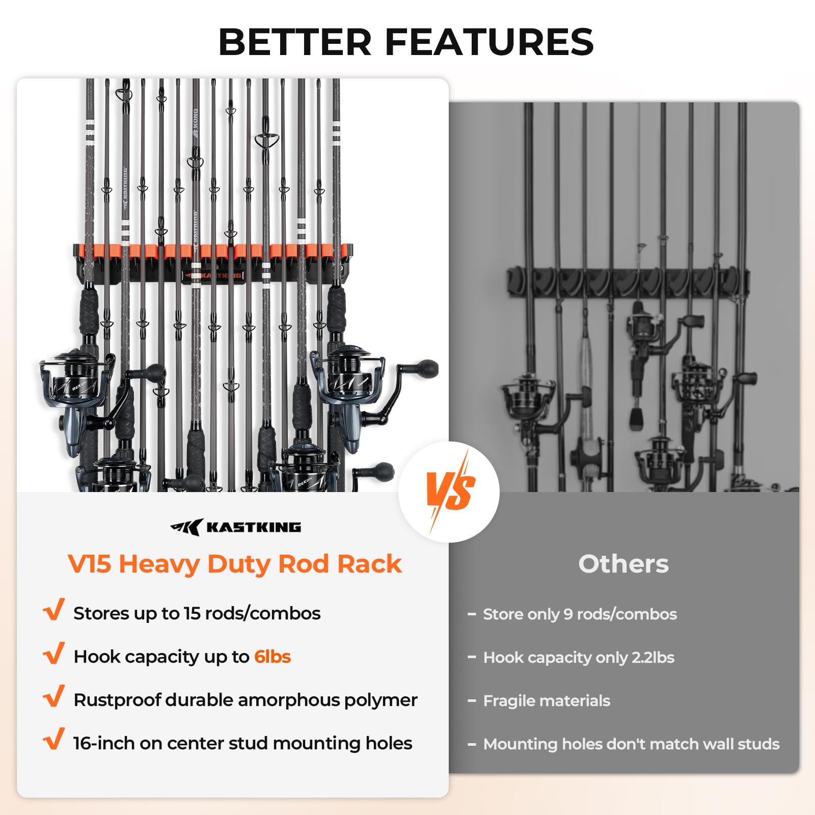 - STORE 15 RODS OR COMBOS – The KastKing V15HD vertical fishing rod rack can store up to 15 rods or include large heavy catfish or saltwater combos in less than 18 inches of horizontal wall space. Most other brands only store 6 combos in the same amount of space. Rods and combos can be mounted virtually anywhere along the length of the rod, permitting reels to be staggered at different heights for minimum storage space