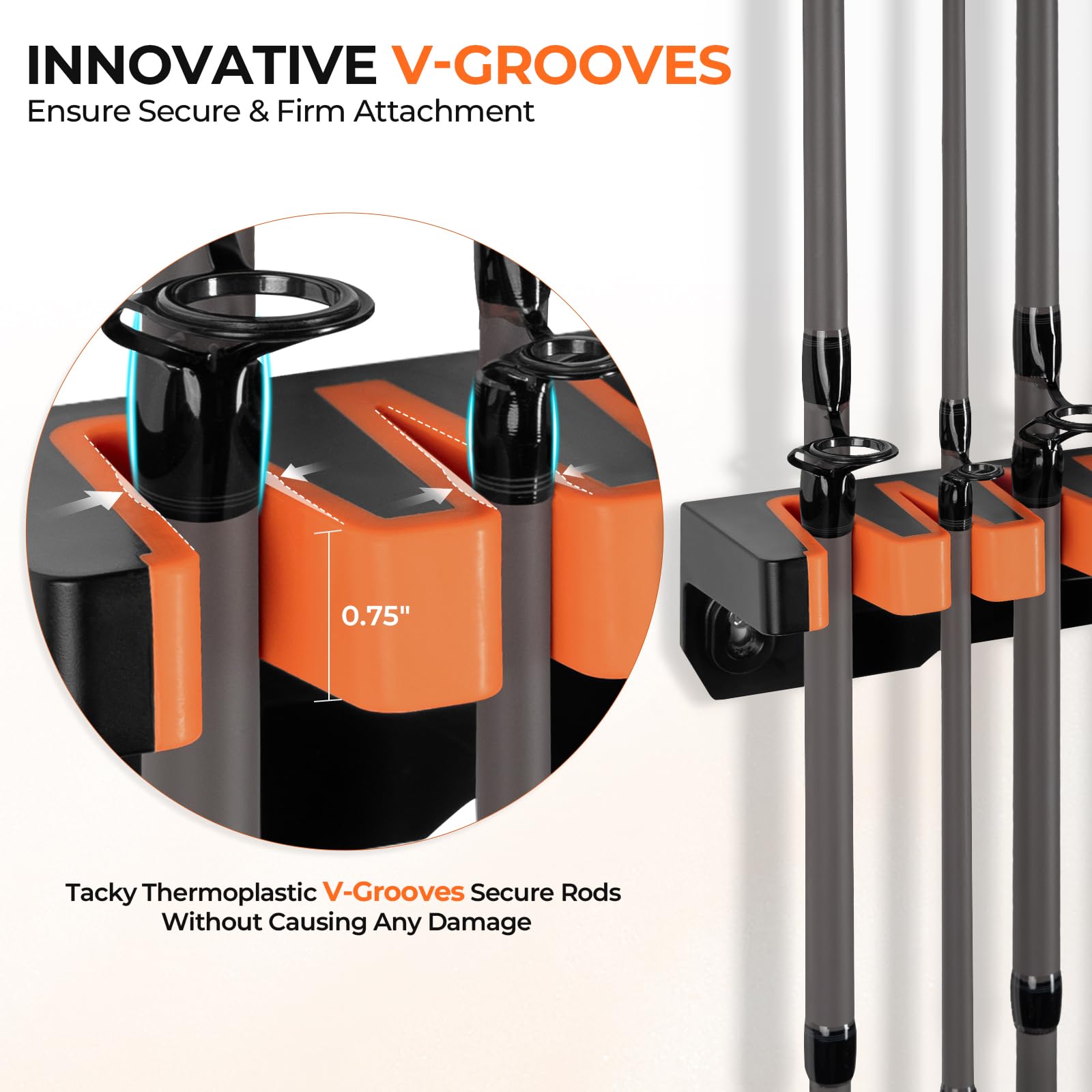 - INNOVATIVE DESIGN – This innovative fishing pole rack is simple and easy to use. Firmly push the rod into either the large or small v-grooves until the polymer grip material grabs the rod. For additional stability, hang the rod with the thread-wrapped line guides just above the v-groove. The tapered v-grooves can accommodate up to a ½” diameter rod with a reel attached. To remove your combo from the fishing rod rack simply grab the rod near the rod rack and pull straight out