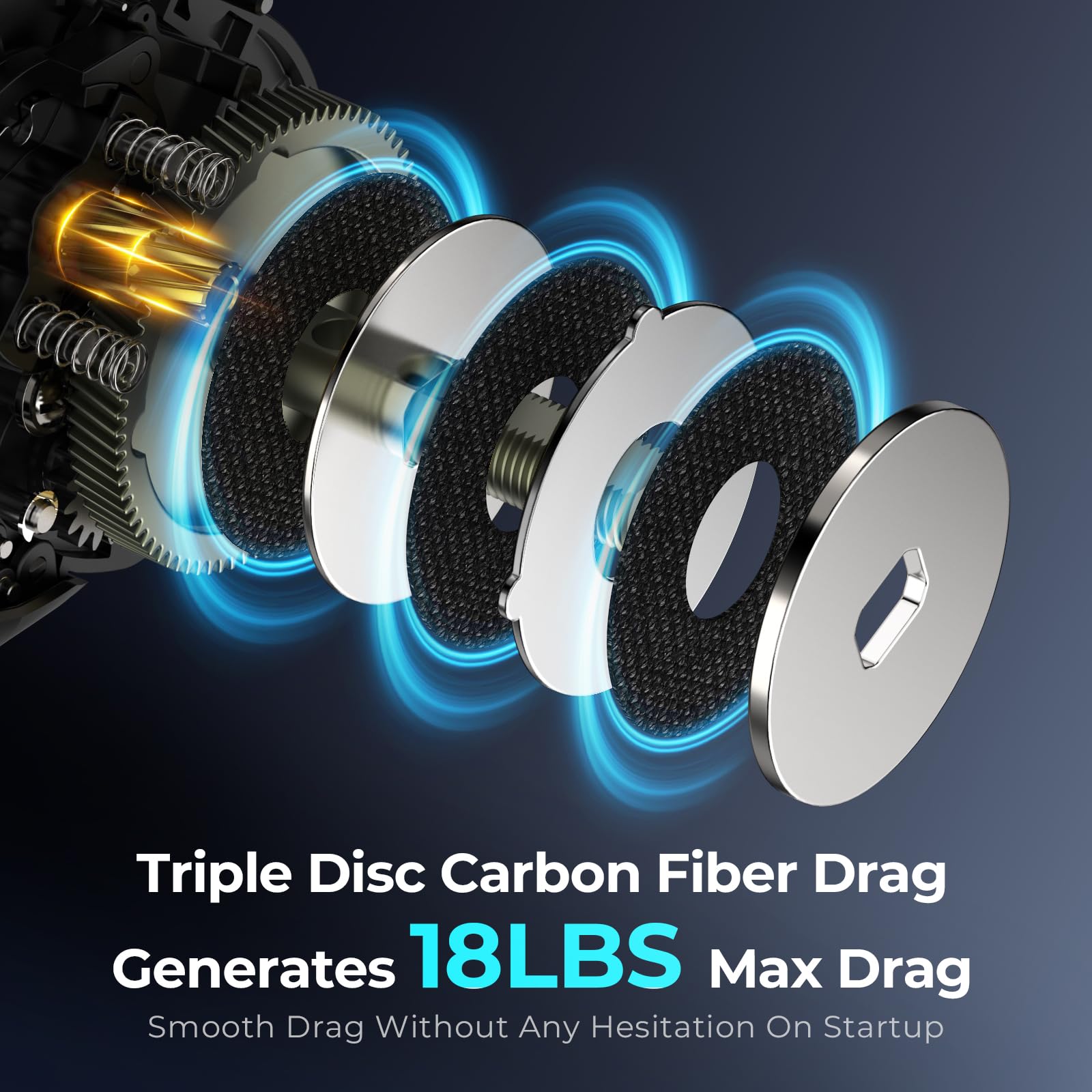 - Impressive Power - Experience premium performance with the Verus Baitcasting Reel, boasting an impressive 18 lbs carbon fiber max drag. Precision-crafted with the triple disc carbon fiber drag system which delivers incredible stopping power and smooth performance to protect leaders and line as braking is applied.