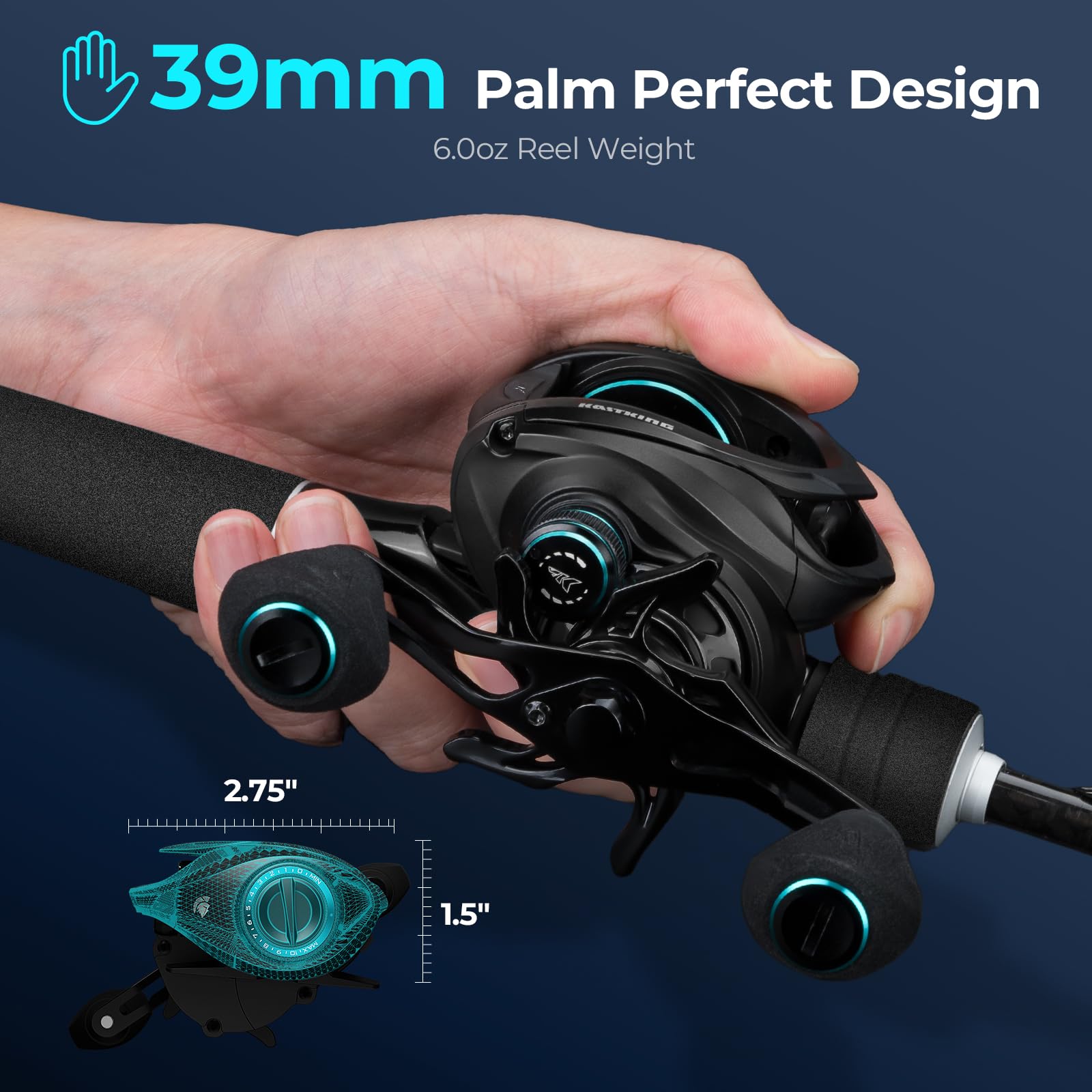 - Ultralight Design - Revolutionary 39mm palm-perfect design of the KastKing Verus Baitcasting Reel fits easily in your hand for all day comfort. Weighing in at a mere 6oz, this reel defies expectations, blending featherlight construction with incredible strength. Experience extraordinary performance with an 8.0:1 high-speed gear ratio. Meticulously crafted with an aluminum main gear, brass pinion gear, and main gear shaft, the Verus is the epitome of power in a lightweight casting reel.