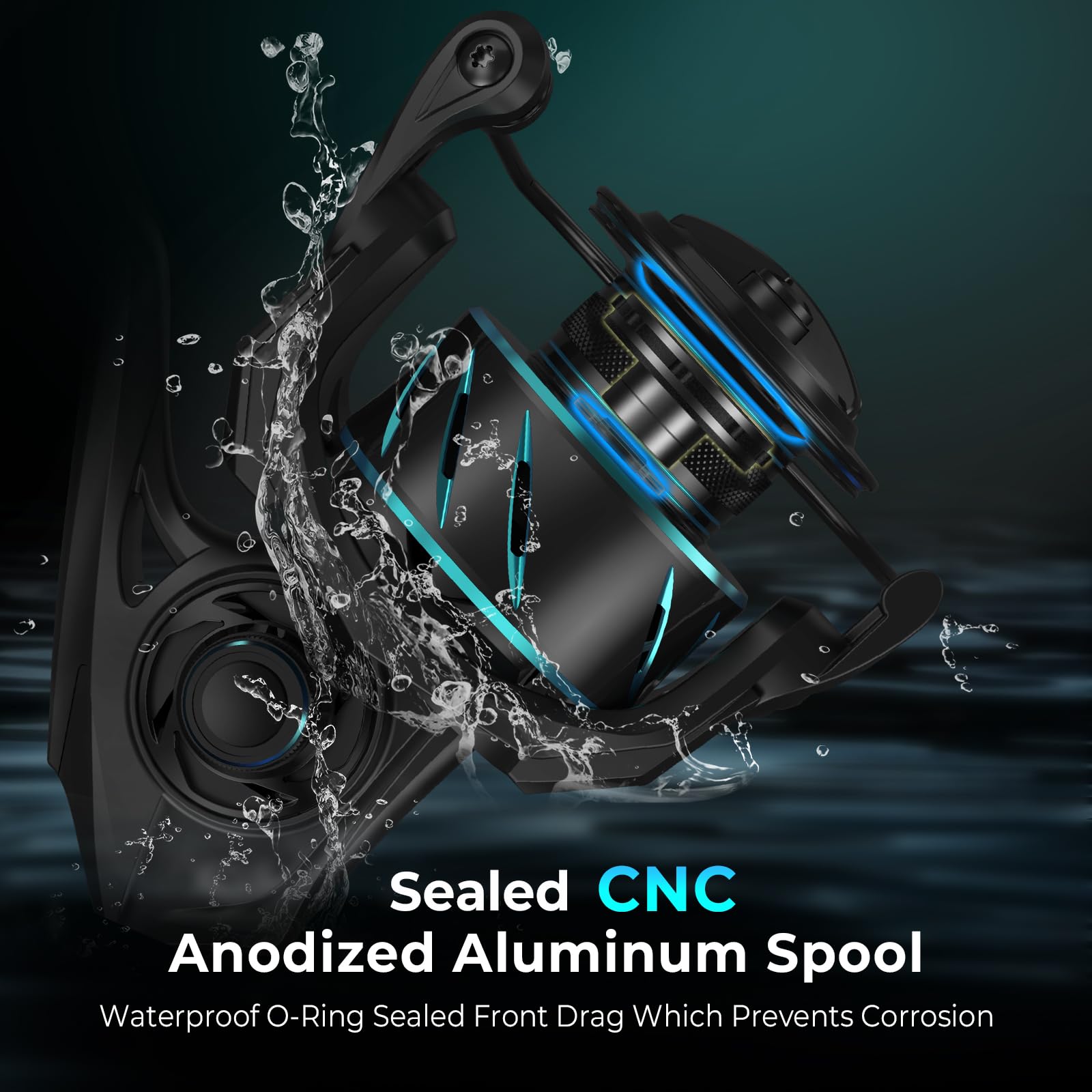 - Enhanced Performance and Comfort: The oversized EVA handle knob not only provides a sure grip but also ensures precise control, offering you the perfect blend of comfort and command. Built for strength and lightweight convenience, this folding mechanism with its direct-drive CNC aluminum handle ensures easy storage without sacrificing durability, while the sealed CNC anodized aluminum spool, featuring a waterproof O-Ring sealed front drag, stands as a testament to corrosion resistance.