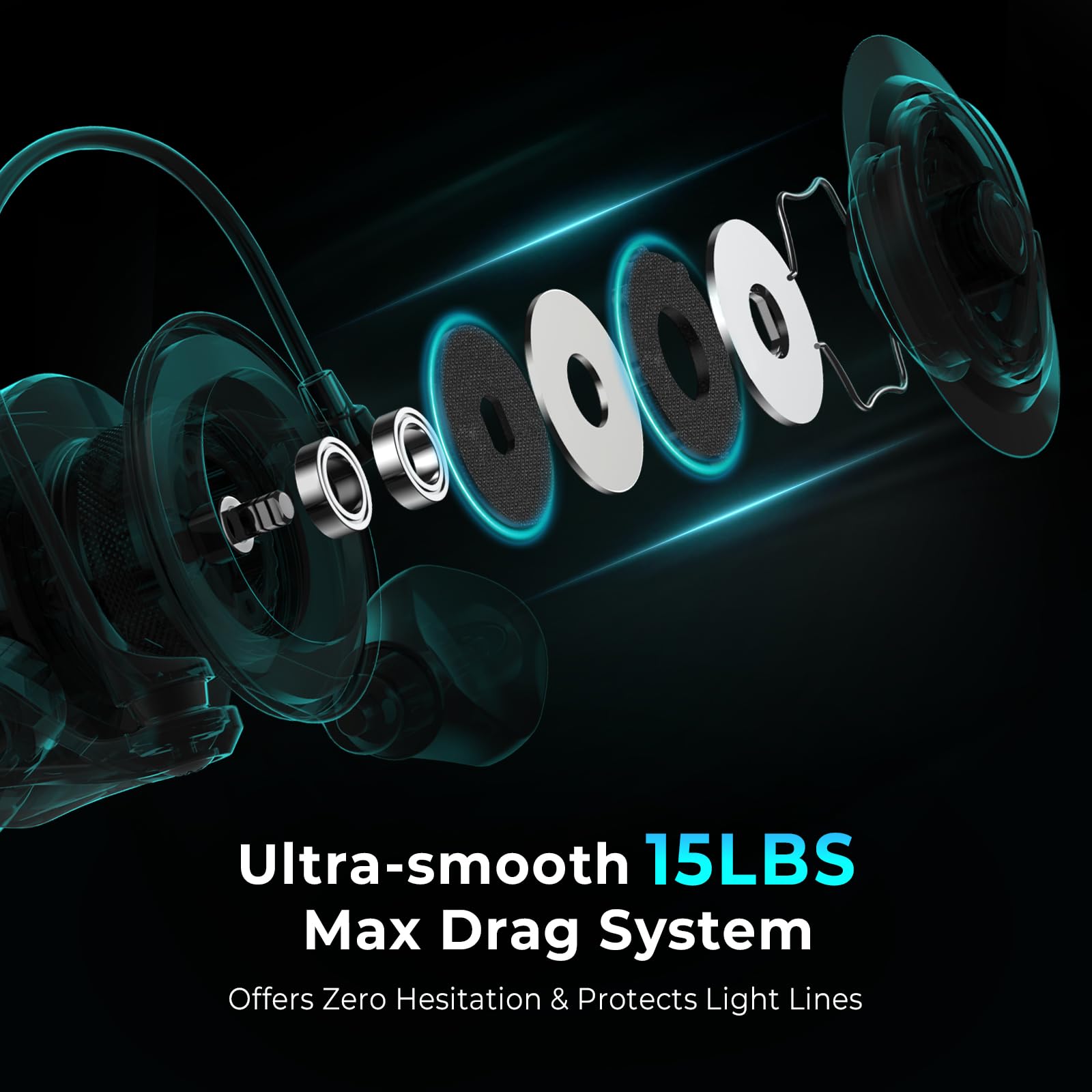 - Exceptionally Strong Drag: This reel offers versatile drag capabilities. Sizes 2000/3000 feature an ultra-smooth double-disc carbon fiber drag system, yielding a remarkable 15lbs of max drag. Sizes 4000/5000 incorporate a triple-disc carbon fiber drag system, delivering 22lbs of max drag. This carbon fiber drag offers more than just power; it guarantees zero hesitation, ensuring the protection of your light lines while fishing.