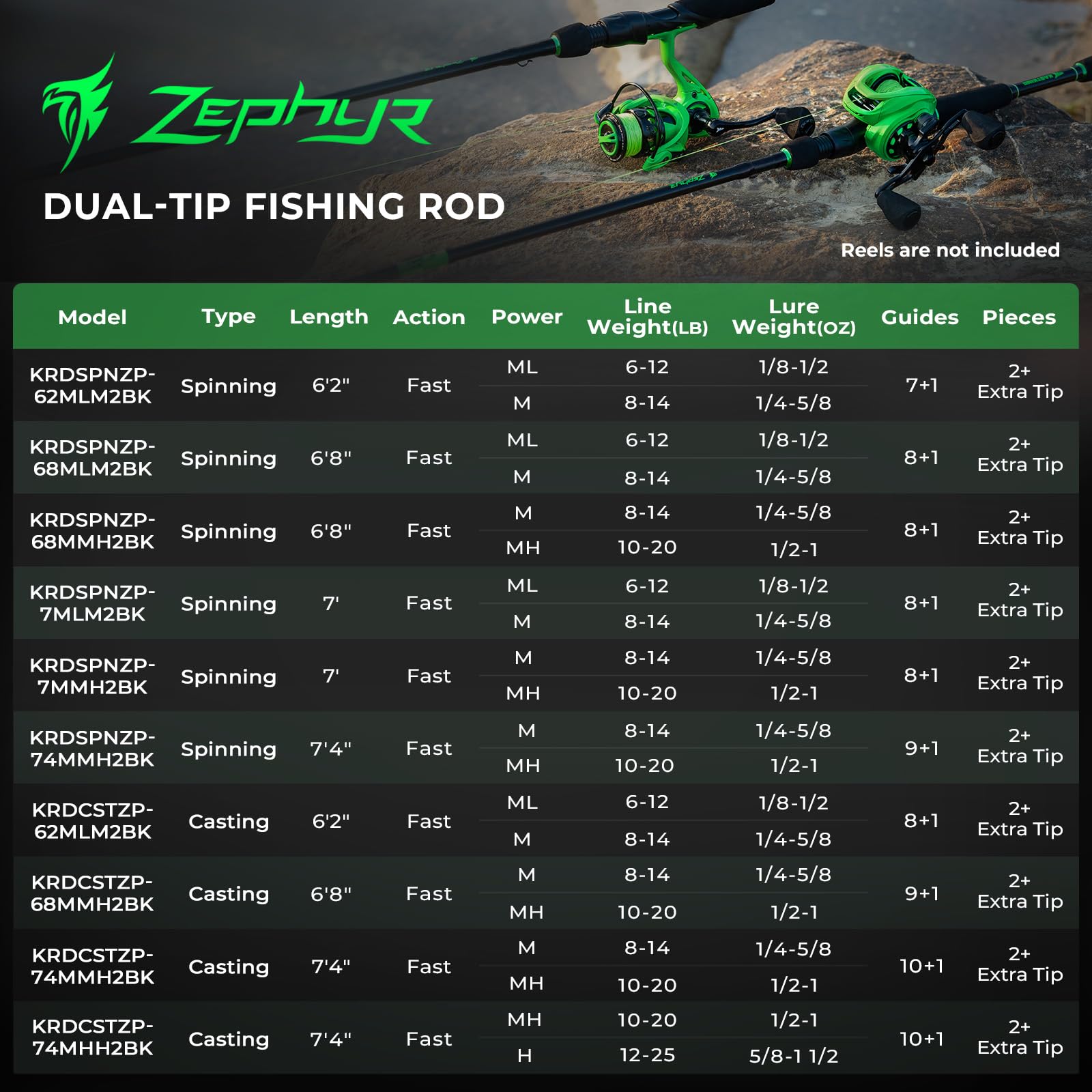 - LIGHTWEIGHT AND HIGH-SENSITIVITY: KastKing Zephyr Dual Tip Fishing Rods are made with lightweight KastFlex IM6 Graphite material, that offer the ideal combination of power, durability, and sensitivity. Suitable for anglers of all skill levels and even experts will love these rods.