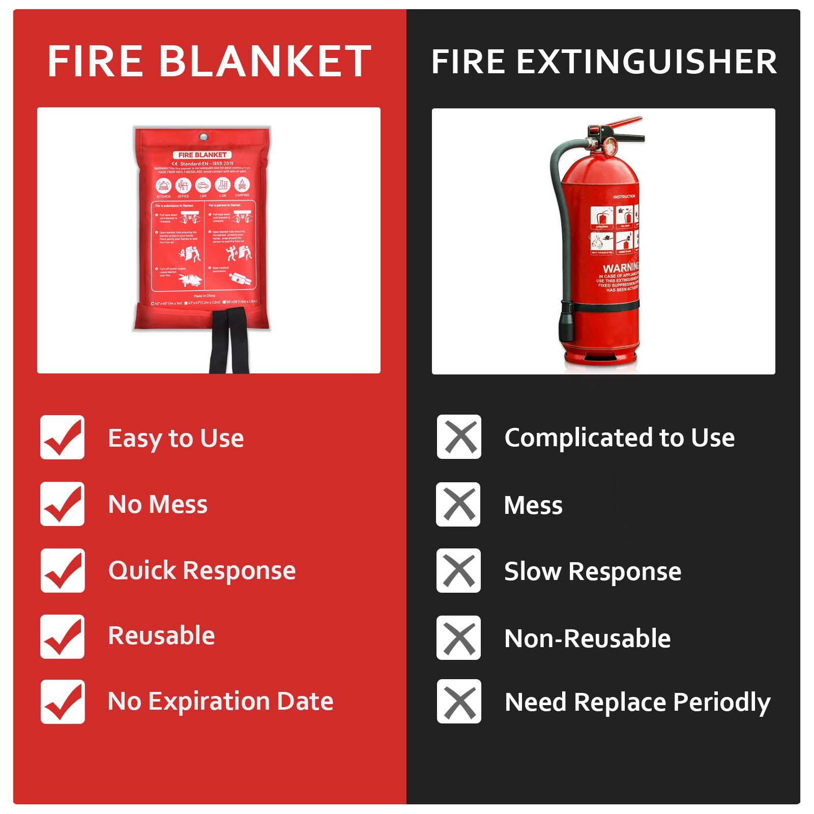 - Fire Blanket vs. Fire Extinguisher: Compared to fire extinguishers, fire blankets are incredibly easy to use. There are no complex instructions to read, no intricate steps to follow, and no training required. A fire blanket never expires, requires no maintenance, and leaves no mess after use.